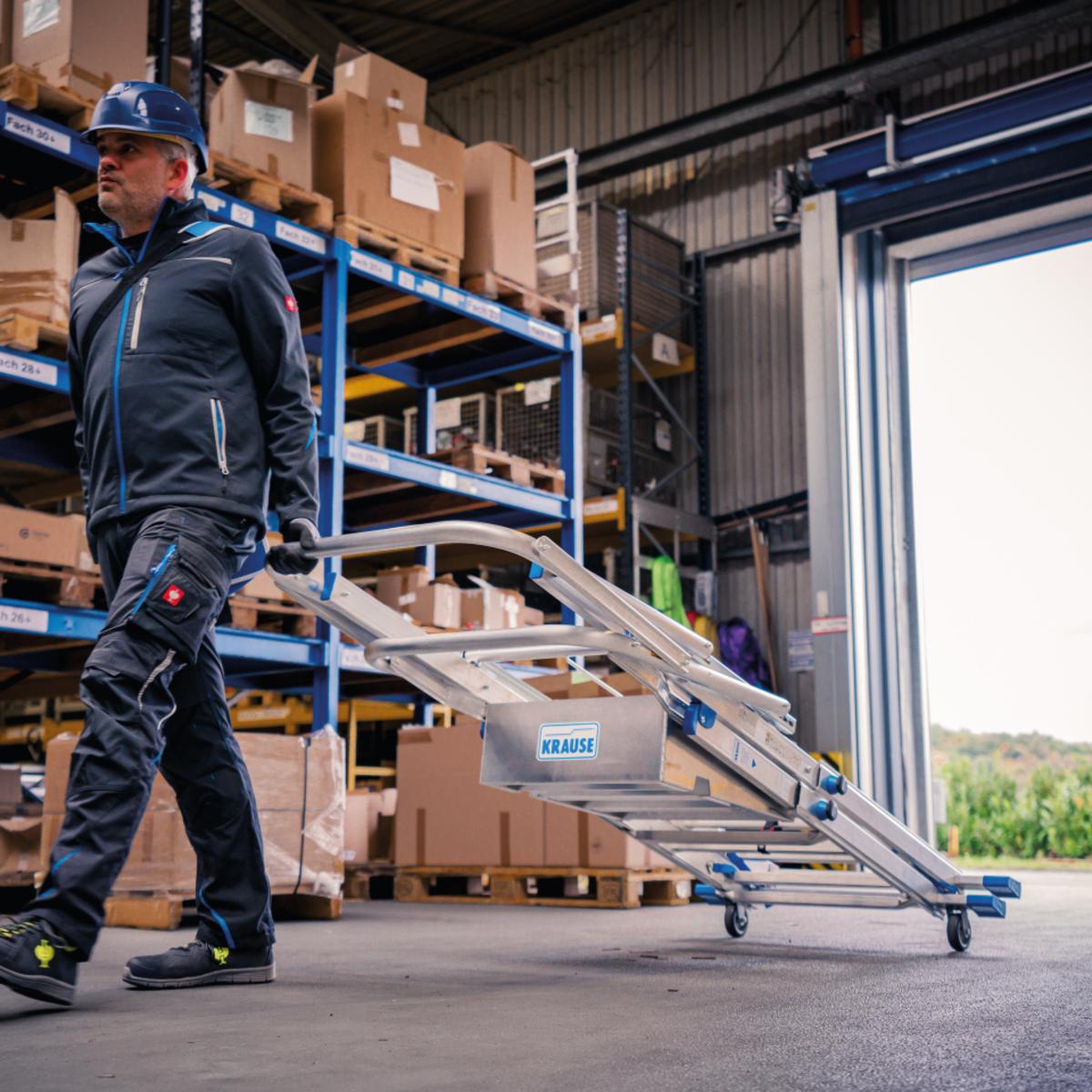 Die KRAUSE Teleskop-Plattformleiter bietet eine sichere und flexible Arbeitsumgebung. Dank der rutschfesten Plattform und des Sicherheitsbügels mit Knieleiste ermöglicht sie beidhändiges Arbeiten. Das ClickMatic-System erlaubt eine einfache Höhenverstellung, ideal für Arbeiten auf Treppen oder unebenen Flächen. Integrierte Fahrrollen erleichtern den Transport, und die kompakte Bauweise ermöglicht platzsparendes Verstauen. Die verbördelten Sprossen sorgen für sicheren Auf- und Abstieg.