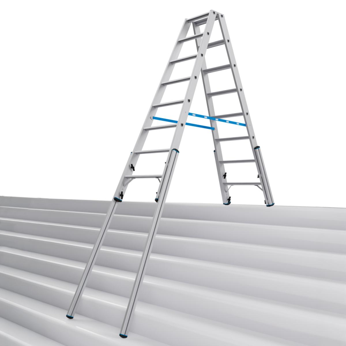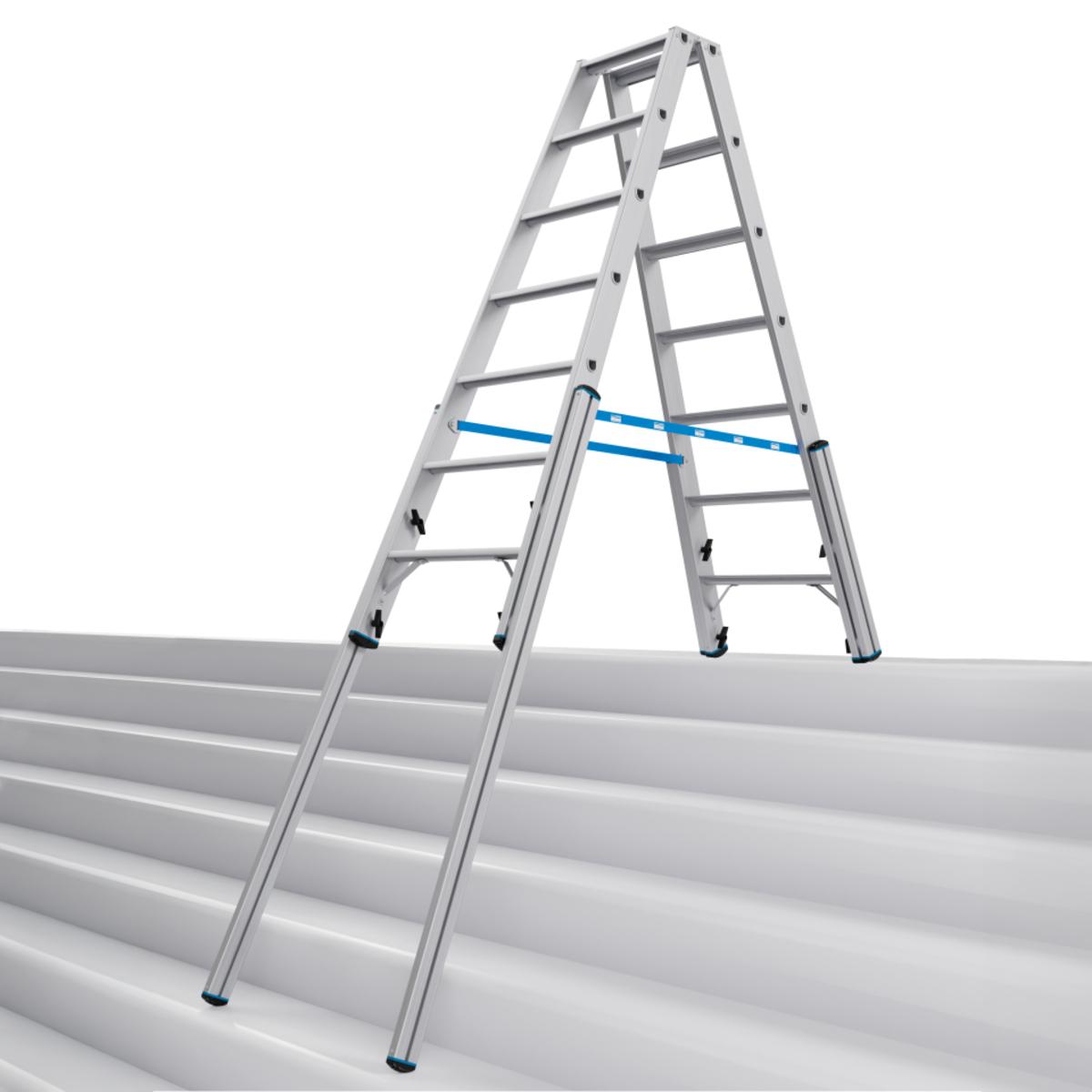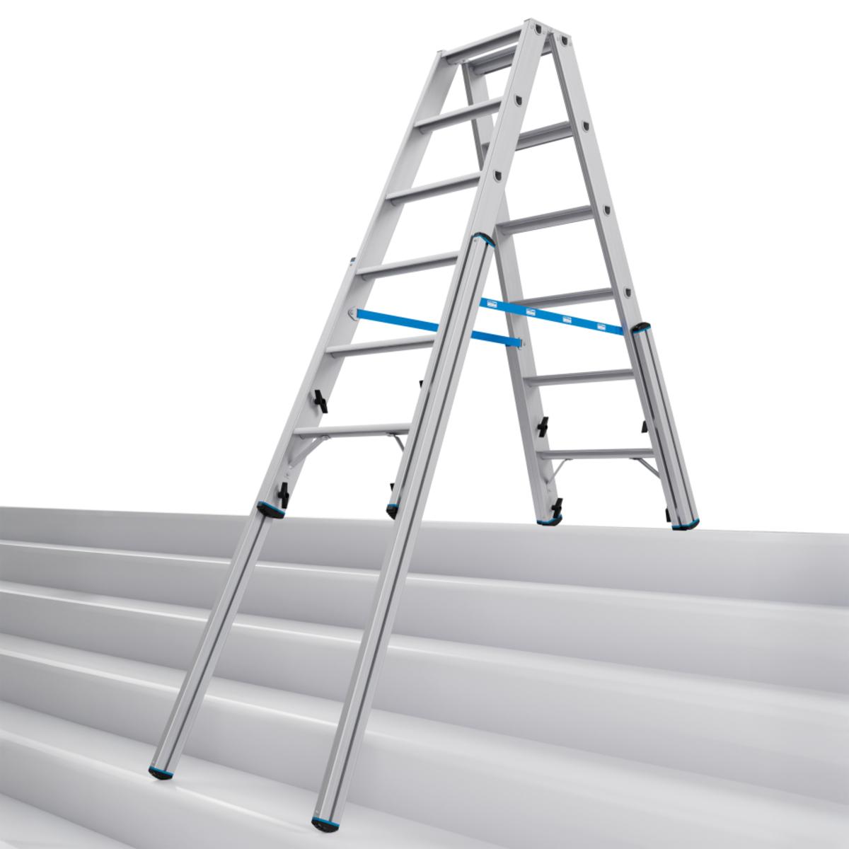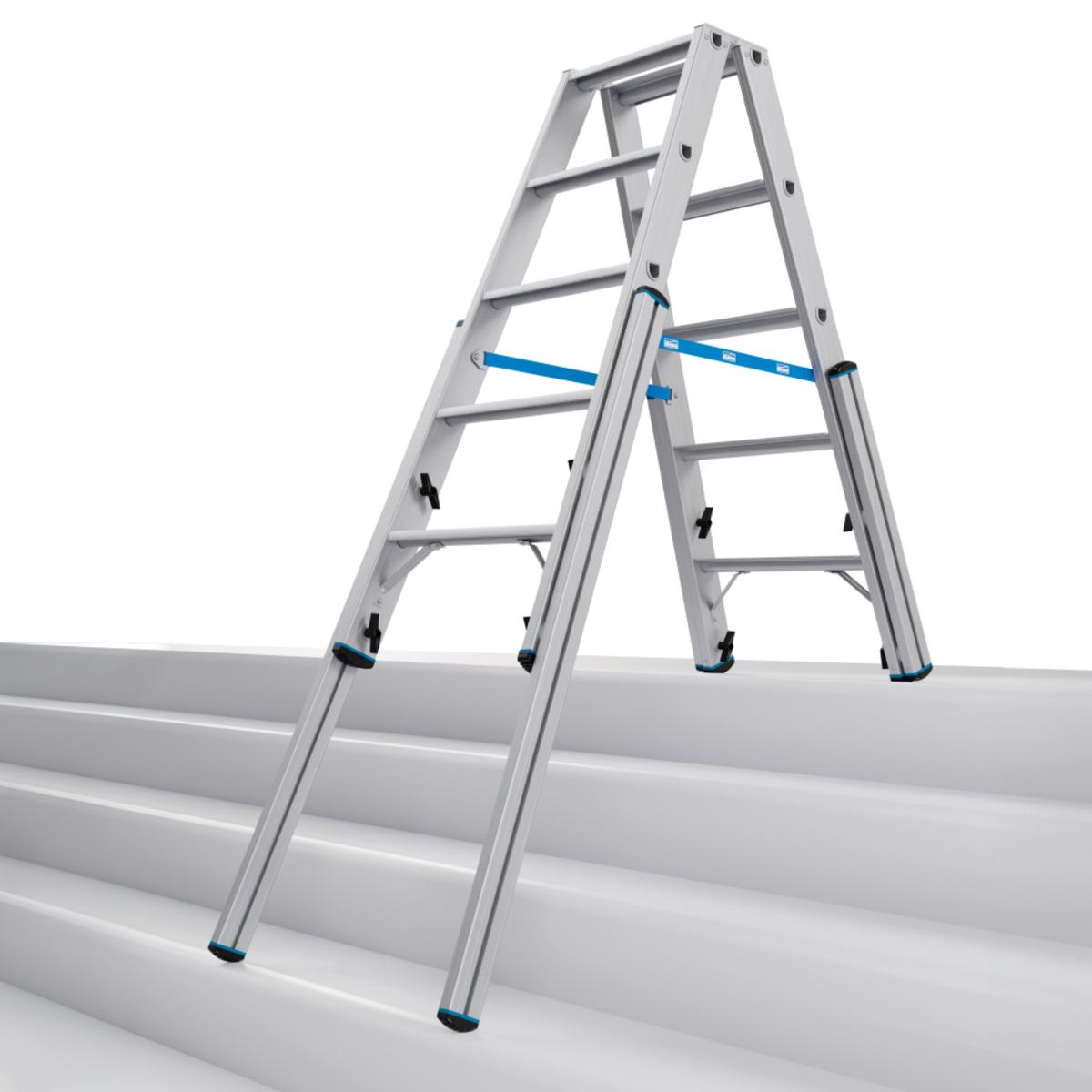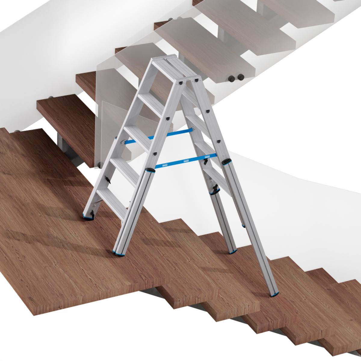 Die Teleskop-Stufen-Doppelleiter ist für professionelle Einsätze gemacht. Sie unterstützt eine sichere Nutzung auf Treppen und Absätzen. Leicht verstellbare Holmverlängerungen und robuste D-Stufen sorgen für stabilen Stand. Die hochfeste verbördelte Stufen-/Holmverbindung sorgt für Langlebigkeit.