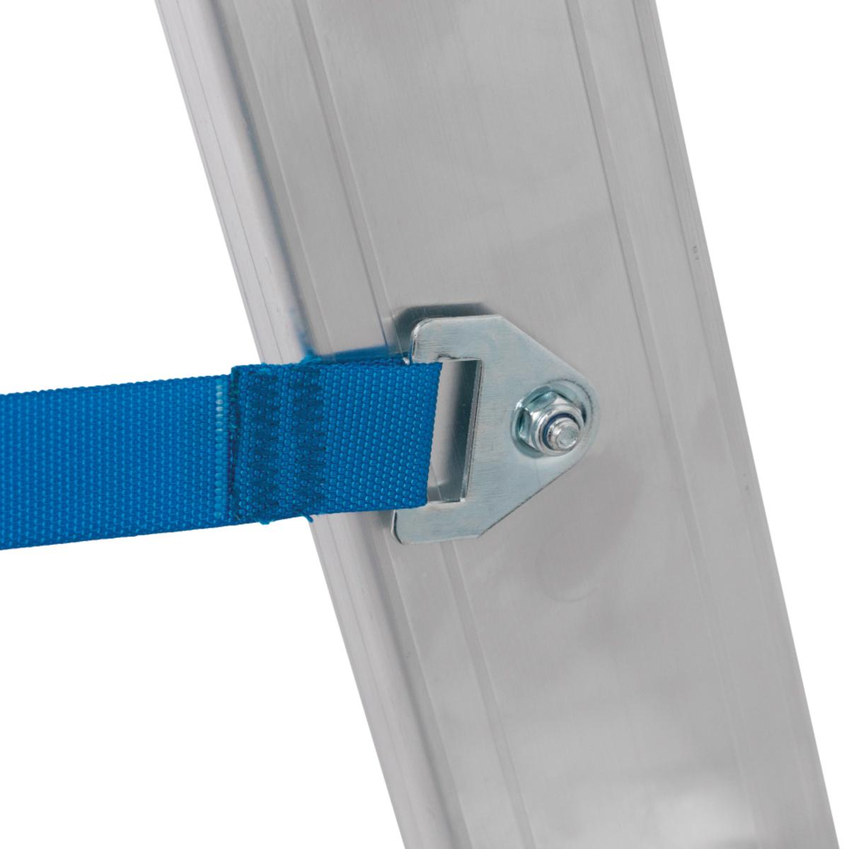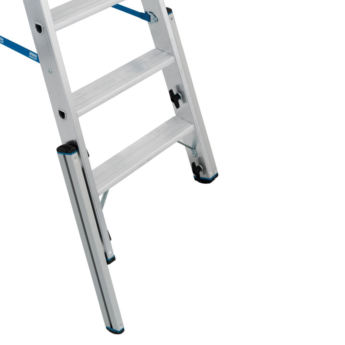 hochfeste Aluminium-Gelenke, hochfest verbördelte Stufen-/Holmverbindung, Profilierte/geriffelte Stufen/Sprossen, SafetyCap Fußstopfen für sicheren Stand, verschraubte Gelenk- und Gurtverbindungen, vier stufenlos verstellbare Holmverlängerungen