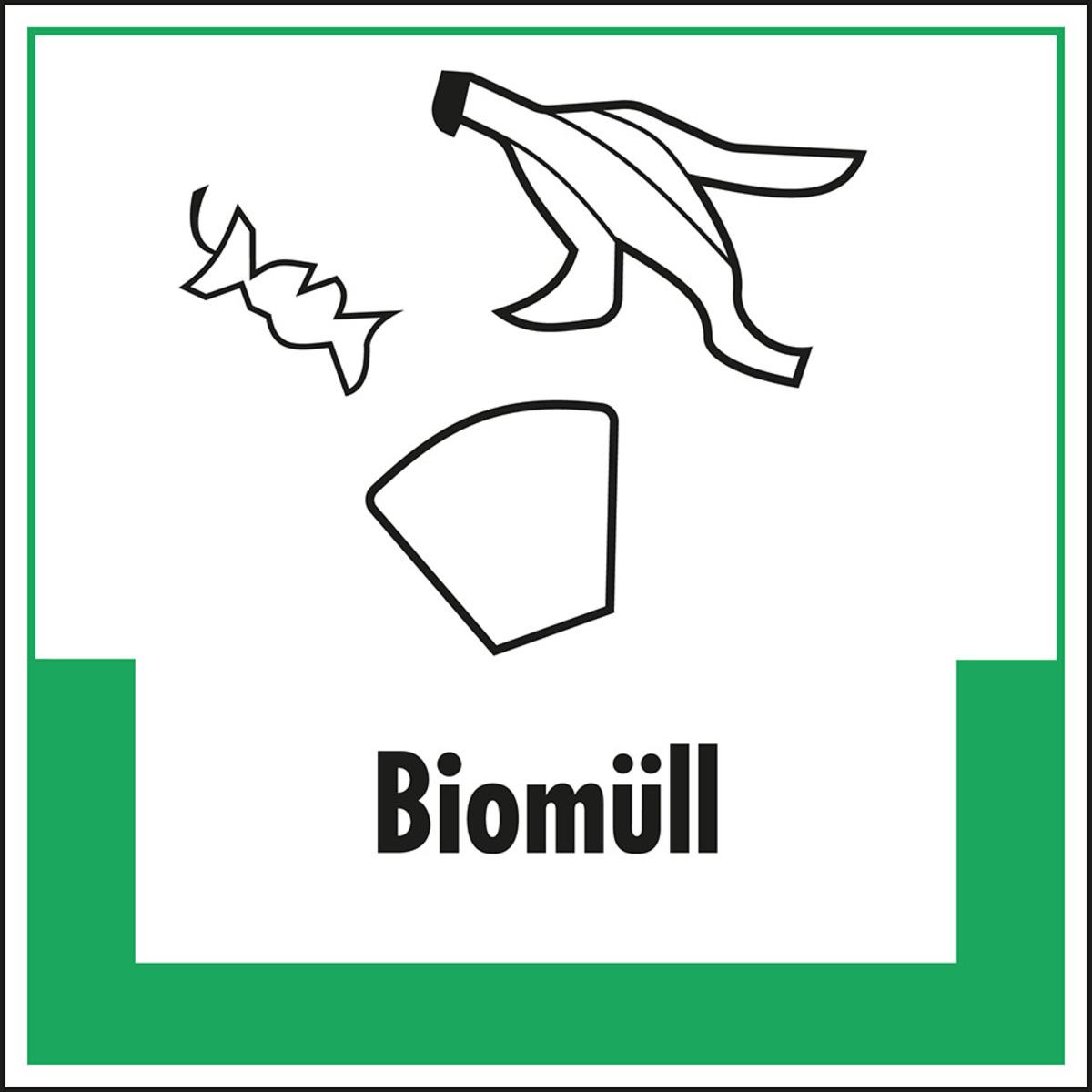 Auswahl: Abfallkennzeichen Biomüll, mit Symbol und Text, Folie, selbstklebend, 200x200mm