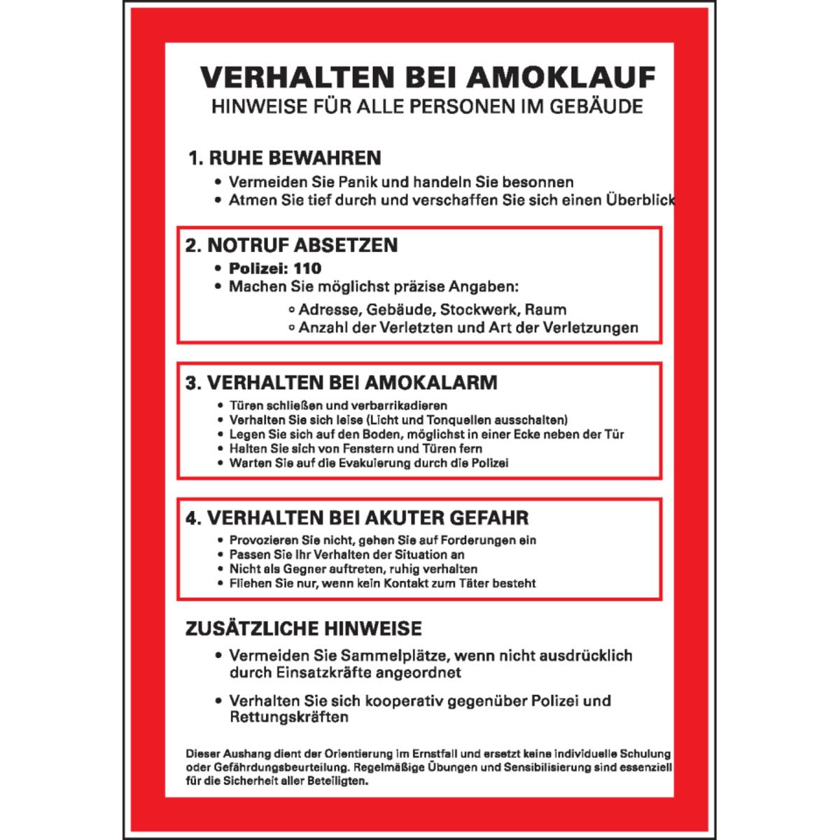 Auswahl: Aushang Verhalten bei Amoklauf - Polizei verständigen, Kunststoff, 210x297mm