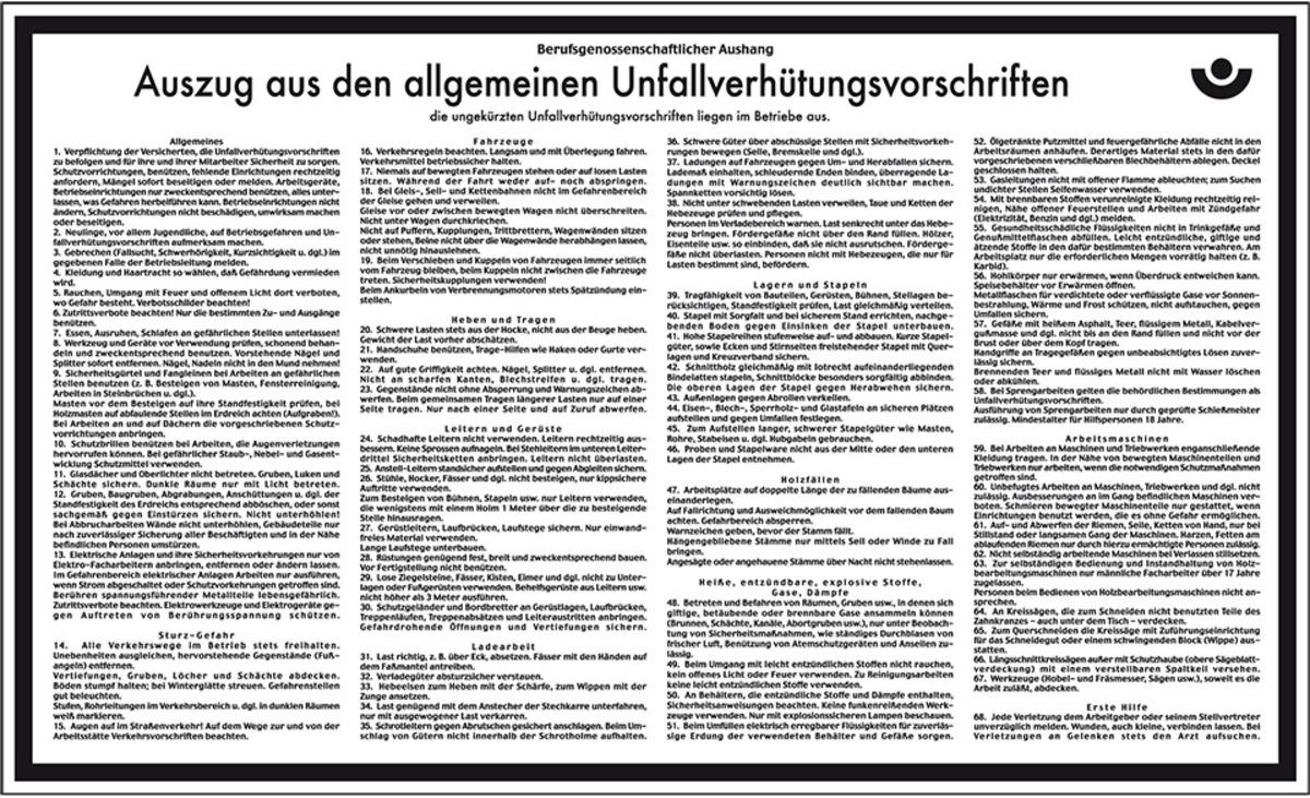 Aushang eines Auszugs der allgemeinen Unfallverhütungsvorschriften.