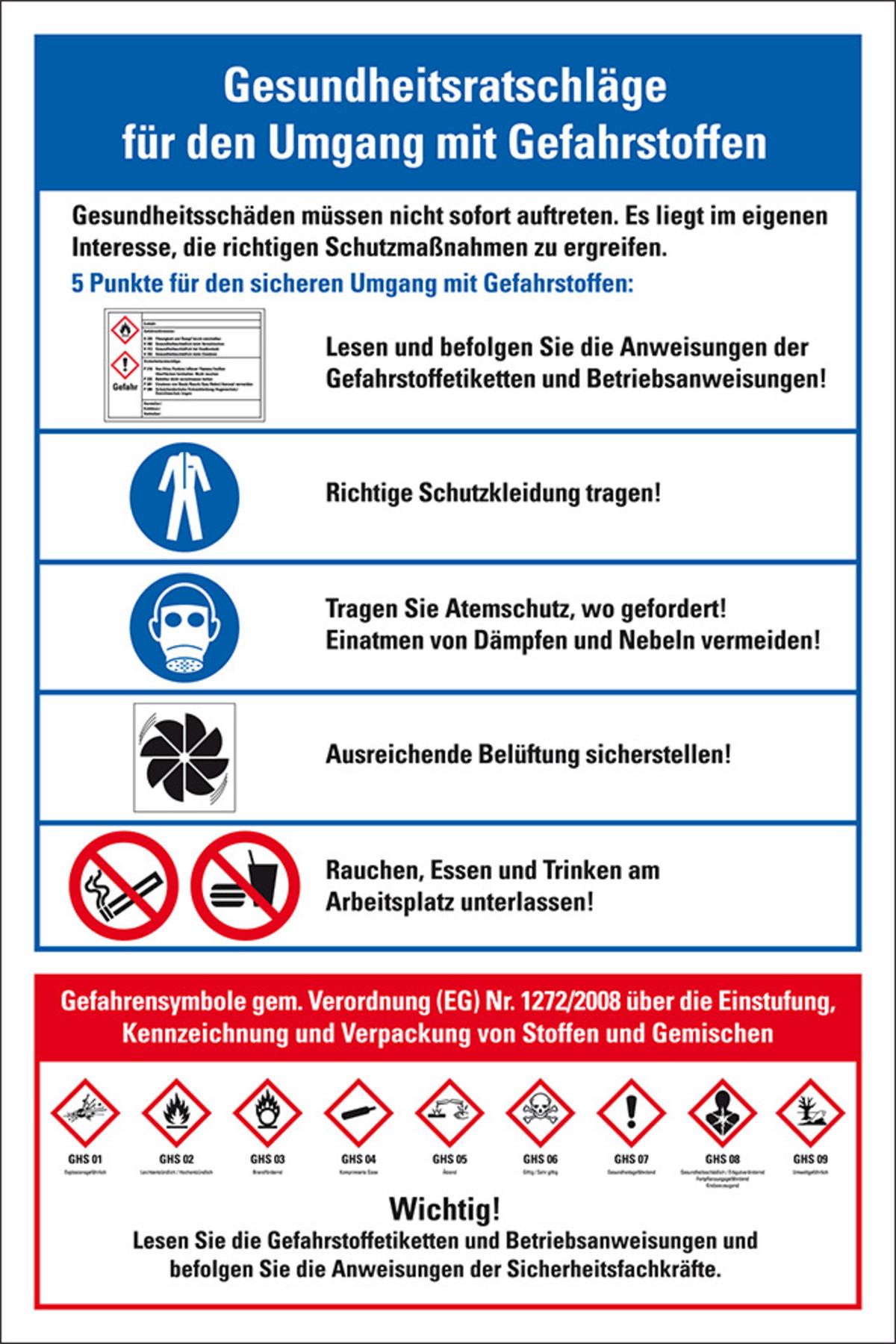 Aushang mit den wichtigsten Gesundheitsratschläge für den Umgang mit Gefahrstoffen