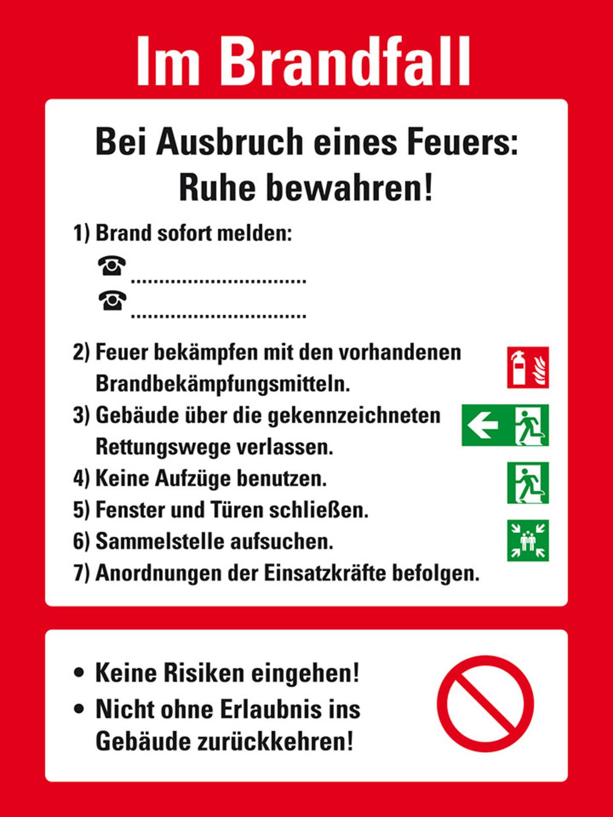 Aushang, welcher die korrekten Verhaltensregeln im Brandfall vermittelt.