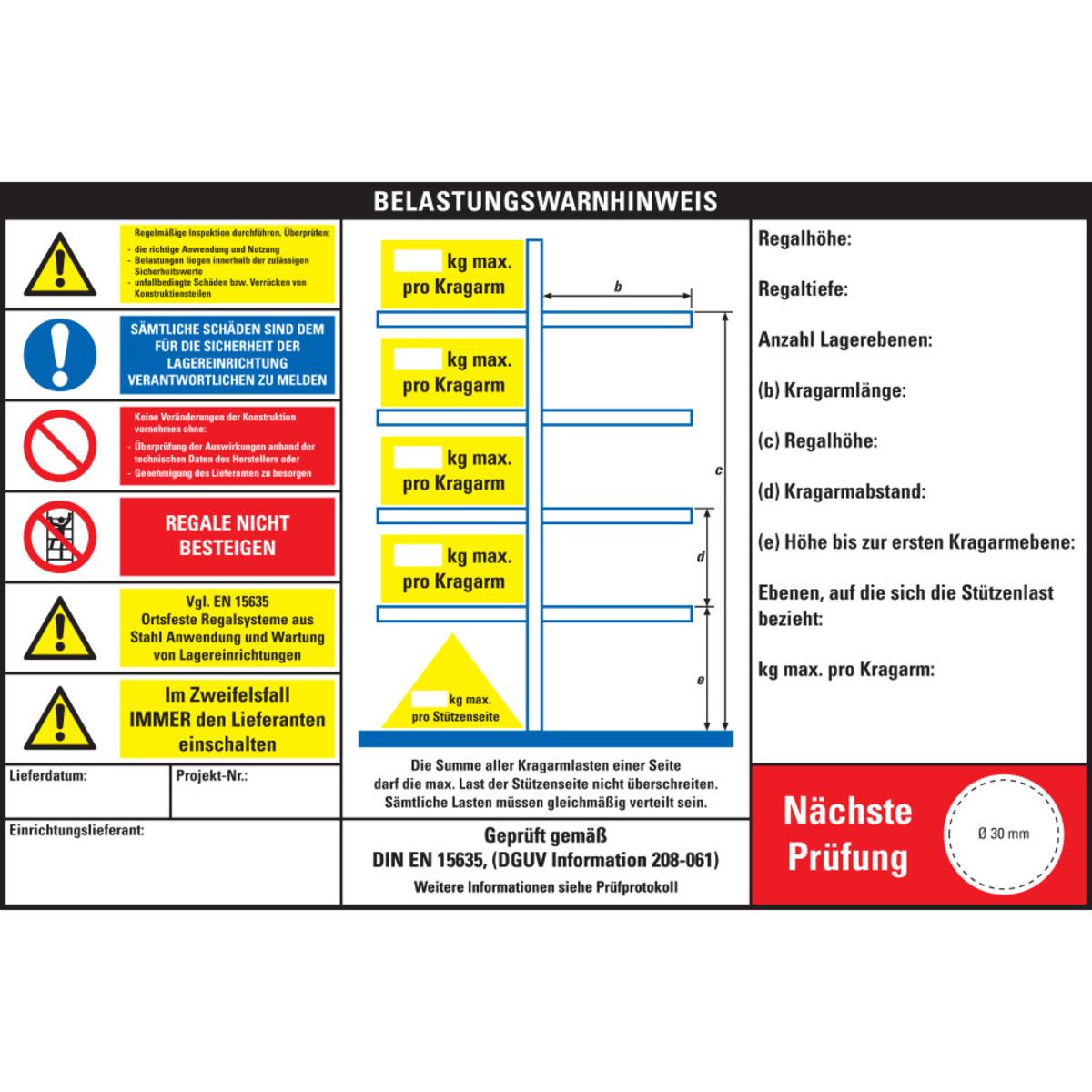 Auswahl: Belastungswarnhinweis für Kragarmregale, DIN EN 15635, Kunststoff, 300x200mm