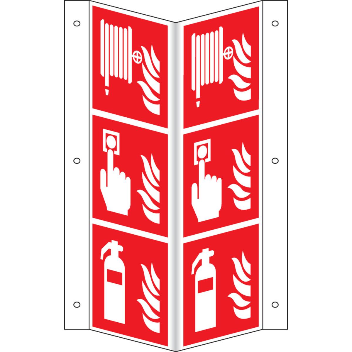 Nasenschild (Winkelschild) mit 3 Brandschutzzeichen zur Kennzeichnung von Bereichen, in denen sich Feuerlöscher, Brandmelder und Löschschläuche befinden