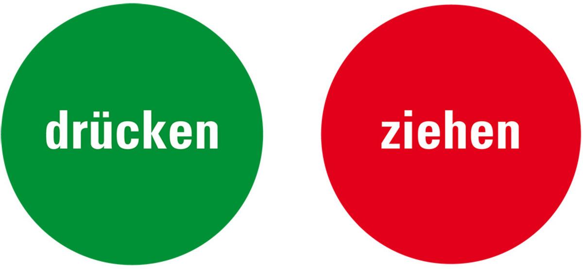 Eindeutiger Türhinweis, Drücken/Ziehen zum Schutz vor Unfällen.