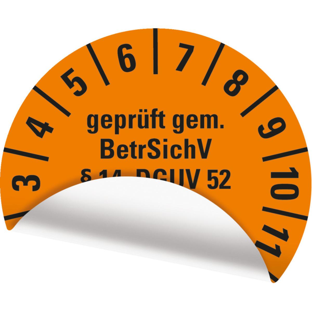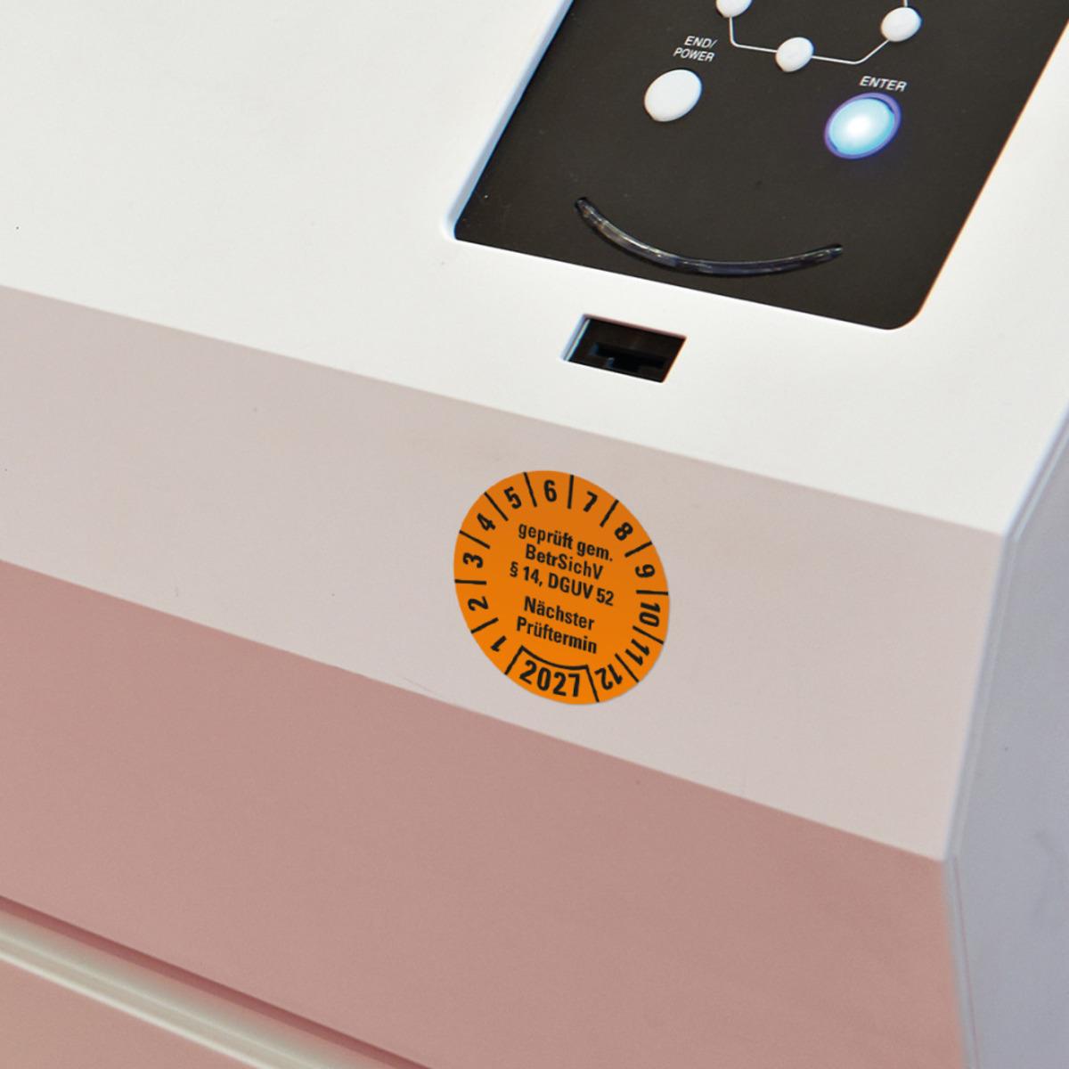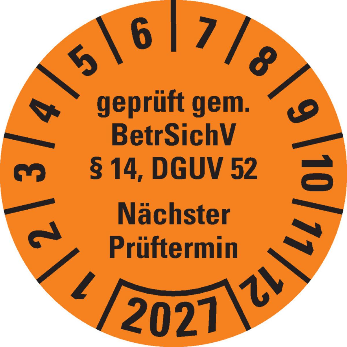 Auswahl: Prüfpl. BetrSichV §14, DGUV52, NP, 2027, orange, Folie, Spezialkleber, Ø30mm, 18/Bogen