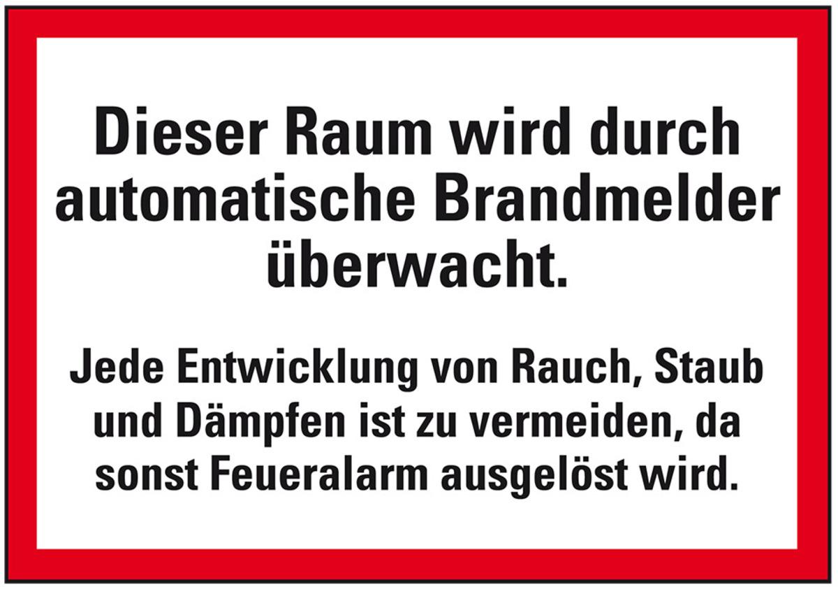 Das Feuerwehrschild "Dieser Raum wird durch automatische Brandmelder überwacht" vermittelt wichtige Informationen für das Verhalten von Mitarbeitern/Besuchern im Alltag.