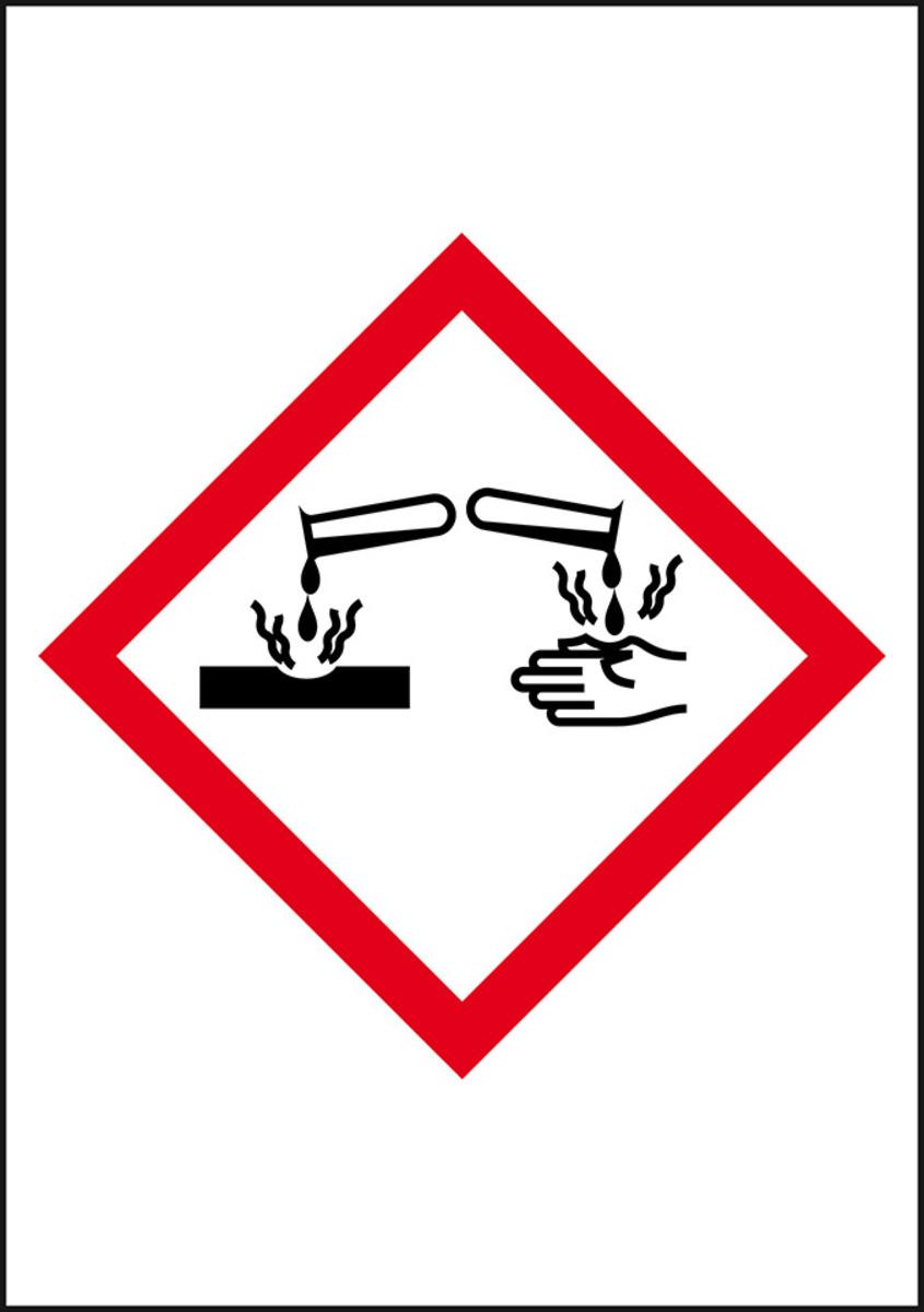 Gefahrensymbole für RKZ Einzeletiketten GHS05/Ätzwirkung zur Kennzeichnung von hautätzenden oder augenschädigenden oder auf Metalle korrosiv wirkenden Stoffen.