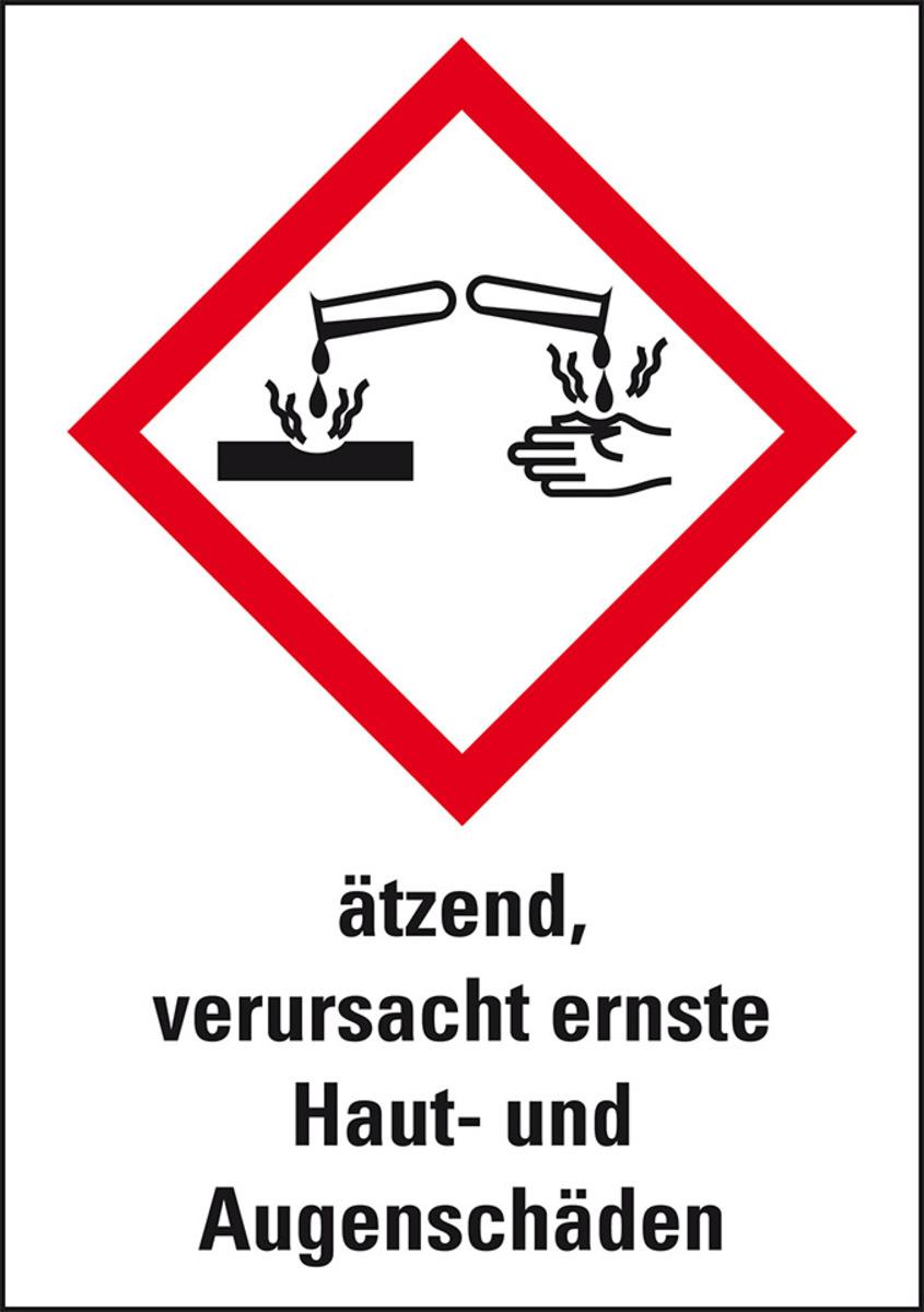 Gefahrensymbol Ätzwirkung GHS05 mit Piktogramm und Gefahrenmerkmal ätzend, verursacht ernste Haut- und Augenschäden