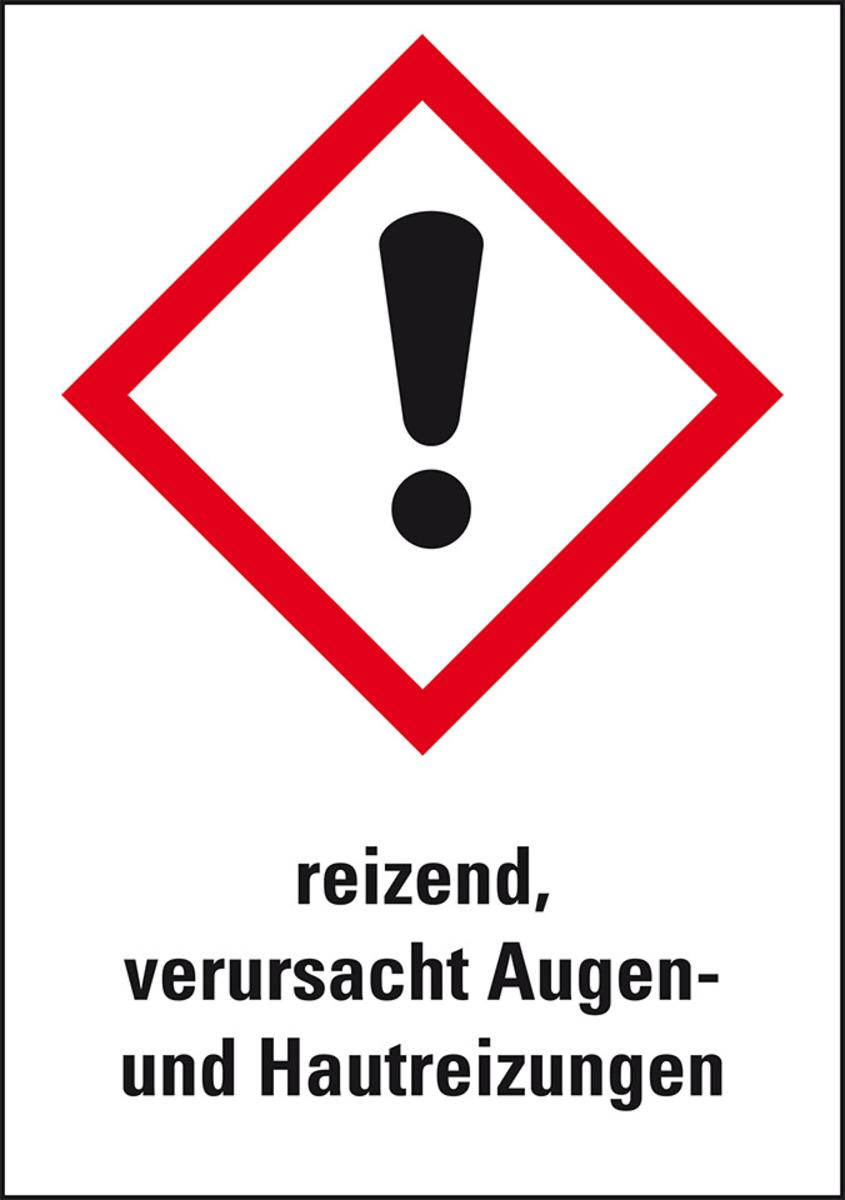 Gefahrensymbol Ausrufezeichen GHS07 mit Piktogramm und Gefahrenmerkmal reizend, verursacht Augen- und Hautreizungen