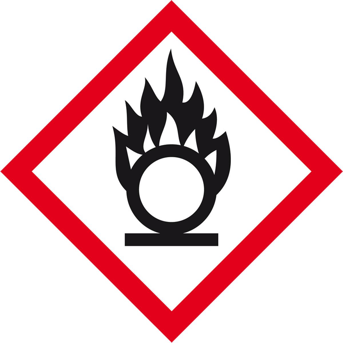 Gefahrensymbol Flamme über einem Kreis GHS03, ohne Signalwort zur Kennzeichnung von entzündend (oxidierend) wirkenden Gasen, Flüssigkeiten und Feststoffen