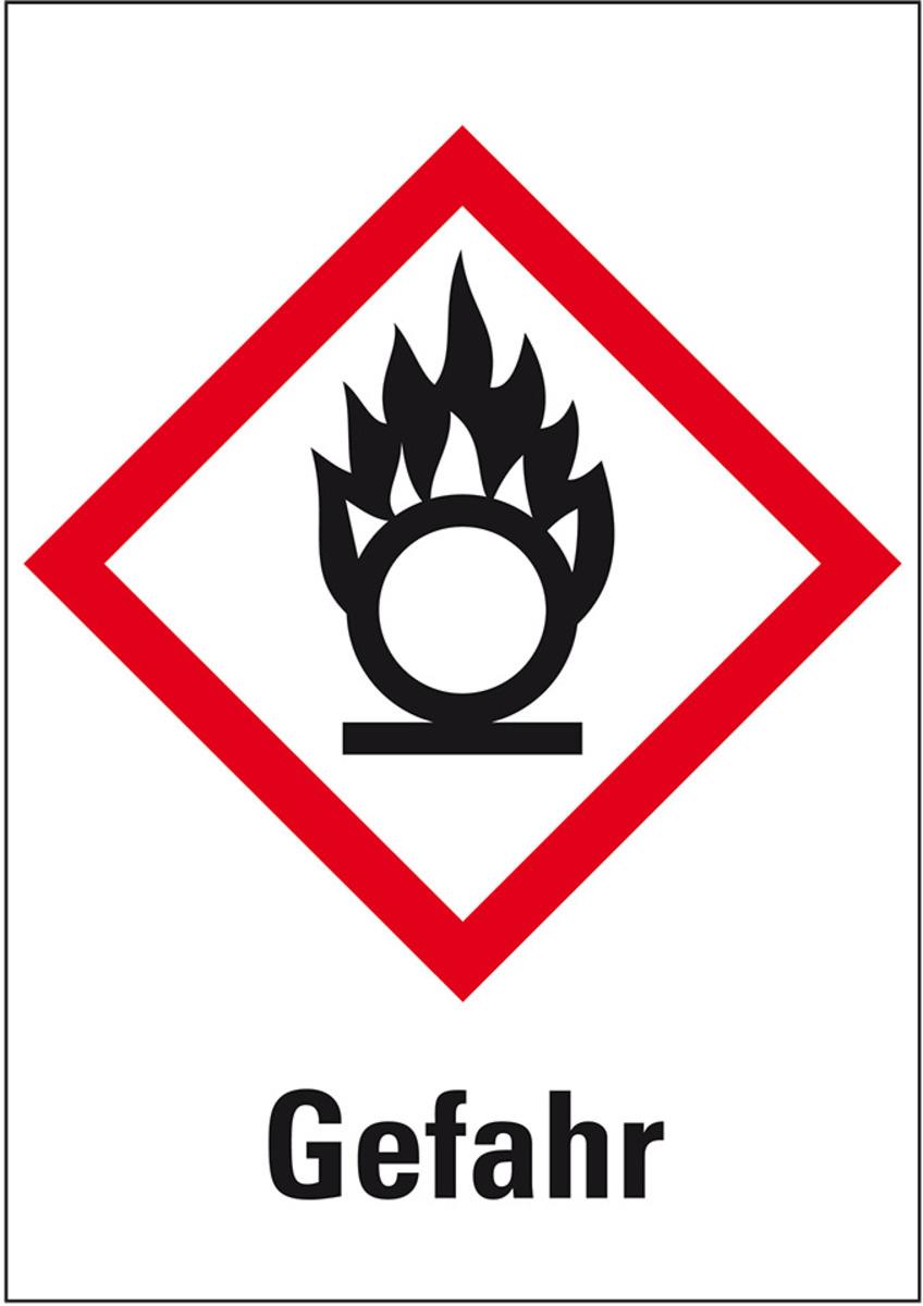 Gefahrensymbol "Flamme über Kreis GHS03 - Gefahr" für die Kennzeichnung entzündend (oxidierend) wirkender Stoffe. Piktogramm und Signalwort.