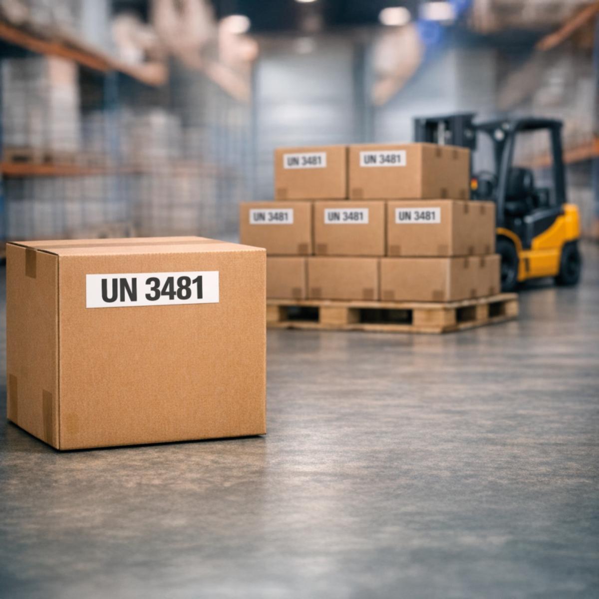 Gefahrgutaufkleber, der auf enthaltene Lithium-Ionen-Batterien hinweist, die entweder in Ausrüstung bzw. mit Ausrüstungen verpackt sind.