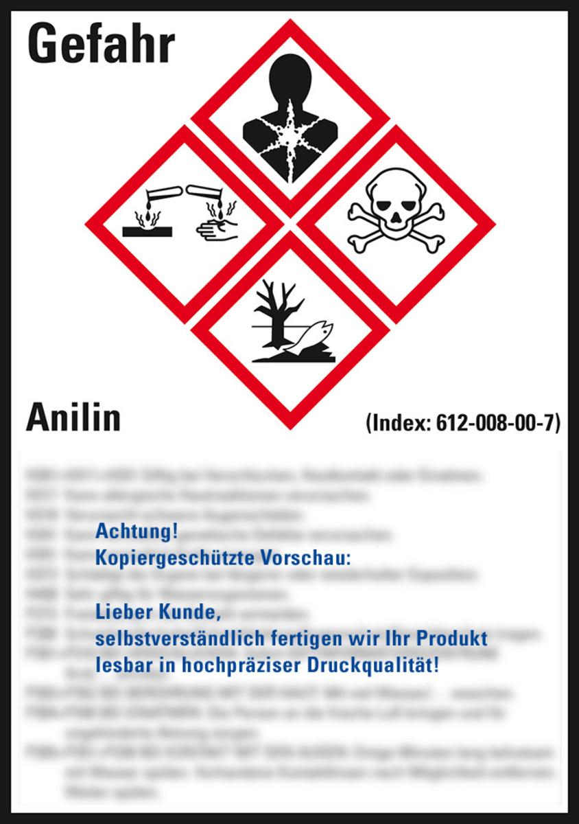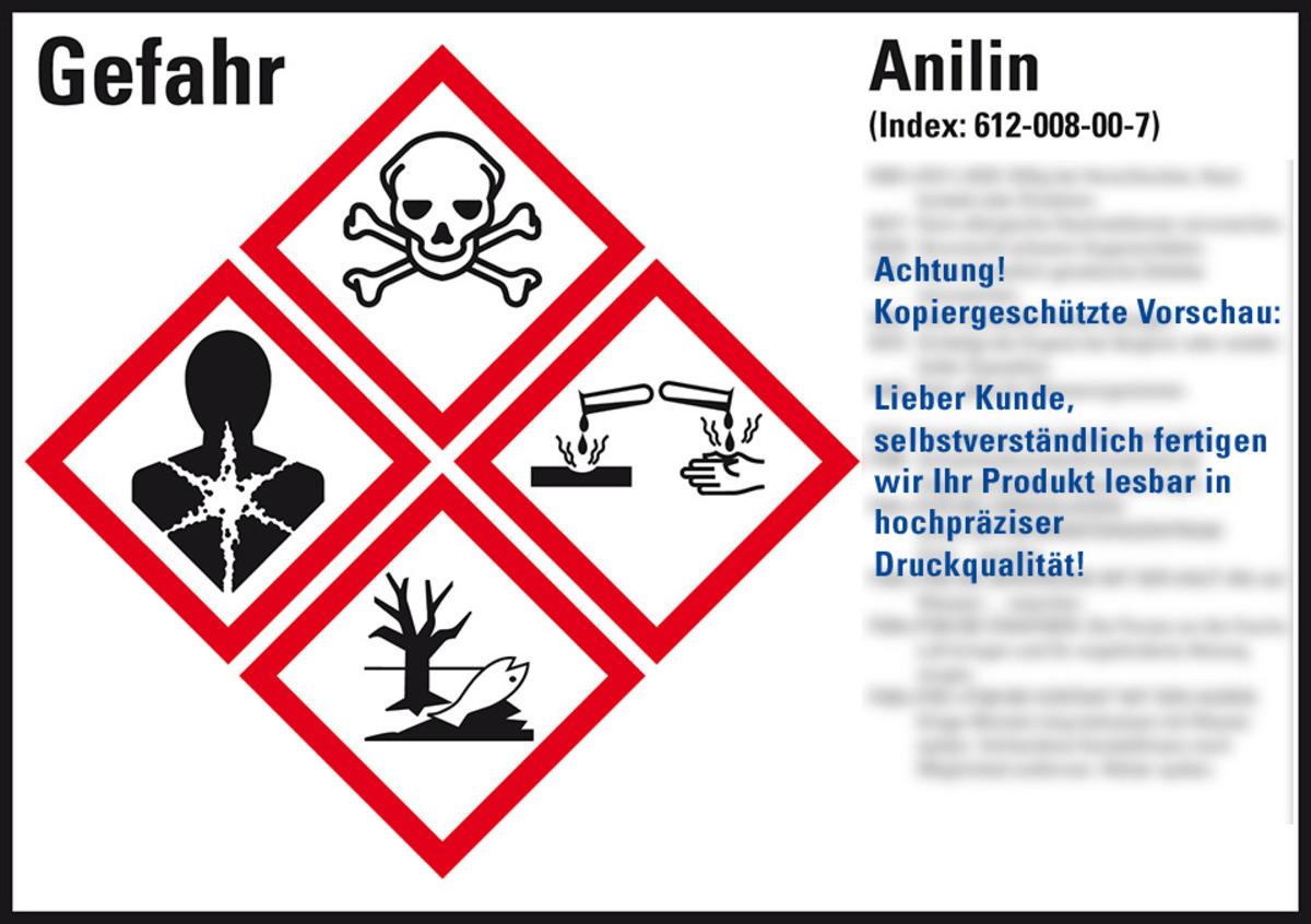 Auswahl: Gefahrstoffetikett Anilin, gem.GefStoffV/GHS/CLP, Folie, 105x74mm, 8/Bogen
