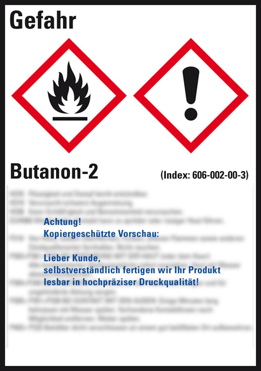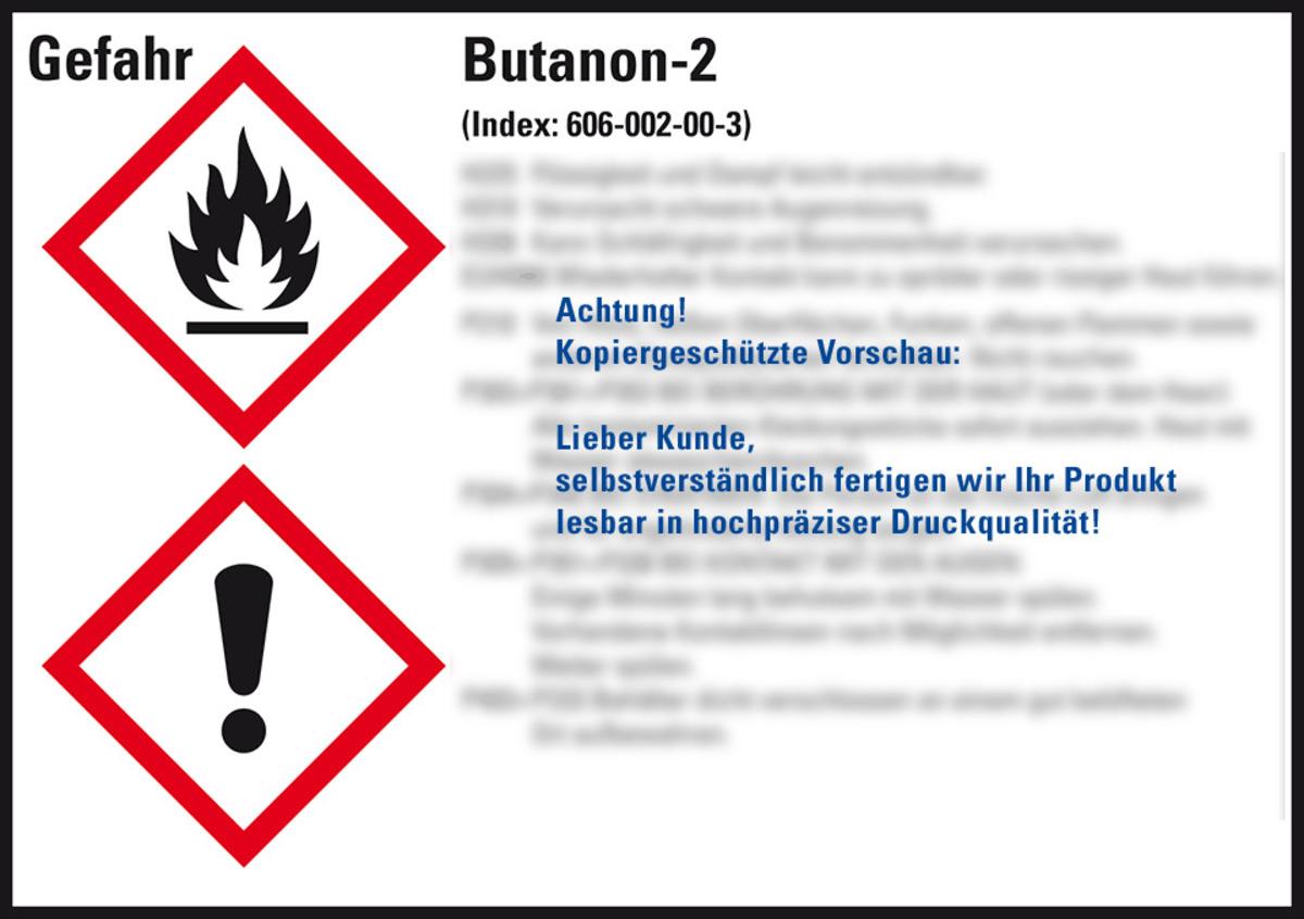 Auswahl: Gefahrstoffetikett Butanon-2, gem.GefStoffV/GHS/CLP, Folie, 148x105mm, 4/Bogen