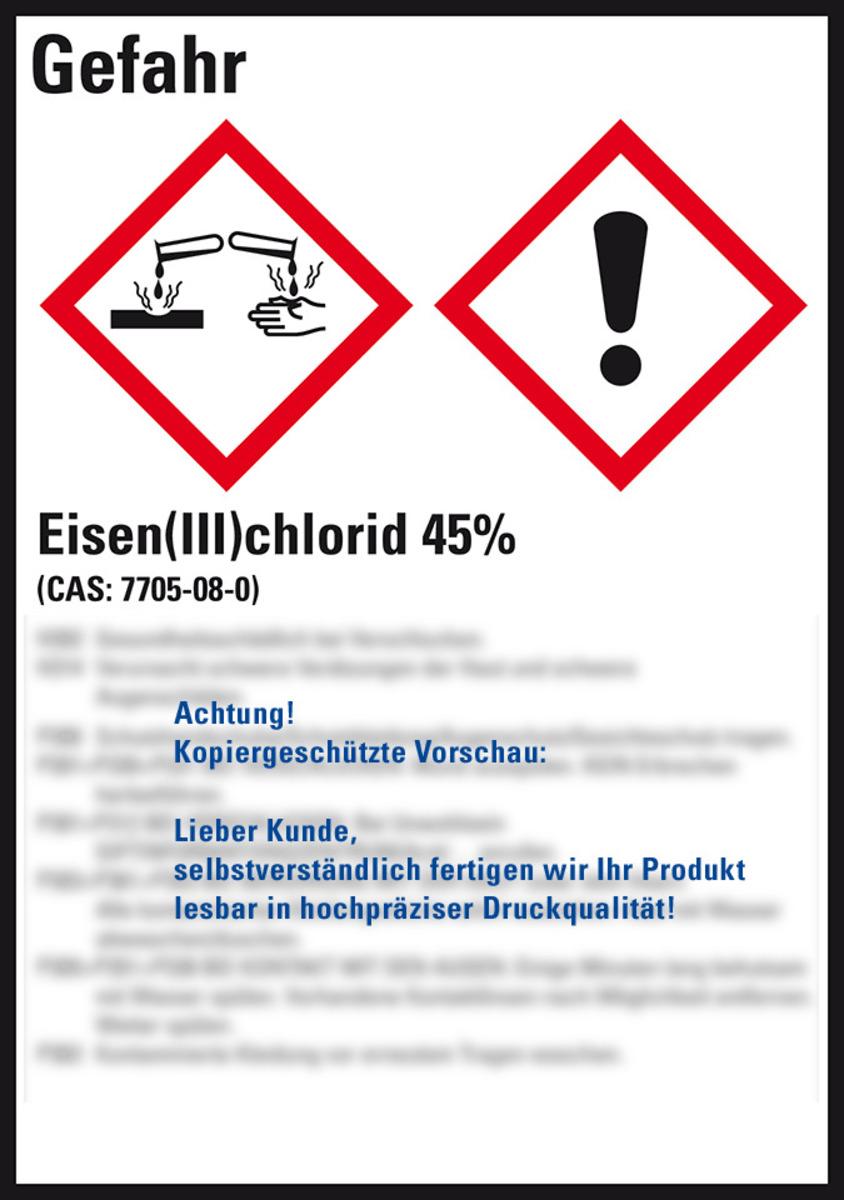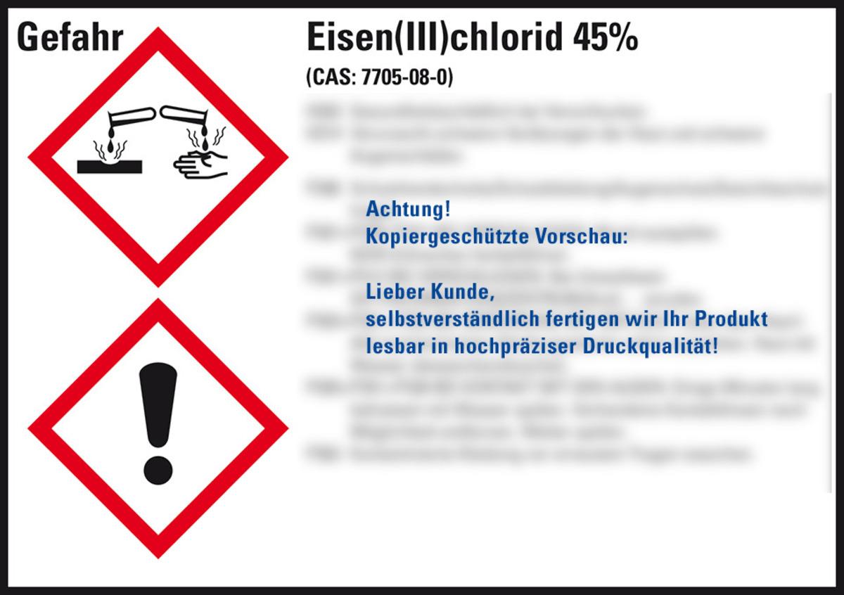 Auswahl: GHS-Etikett Eisen(III)chlorid 45%, gem.GefStoffV/GHS/CLP, Folie, 148x105mm, 4/Bogen