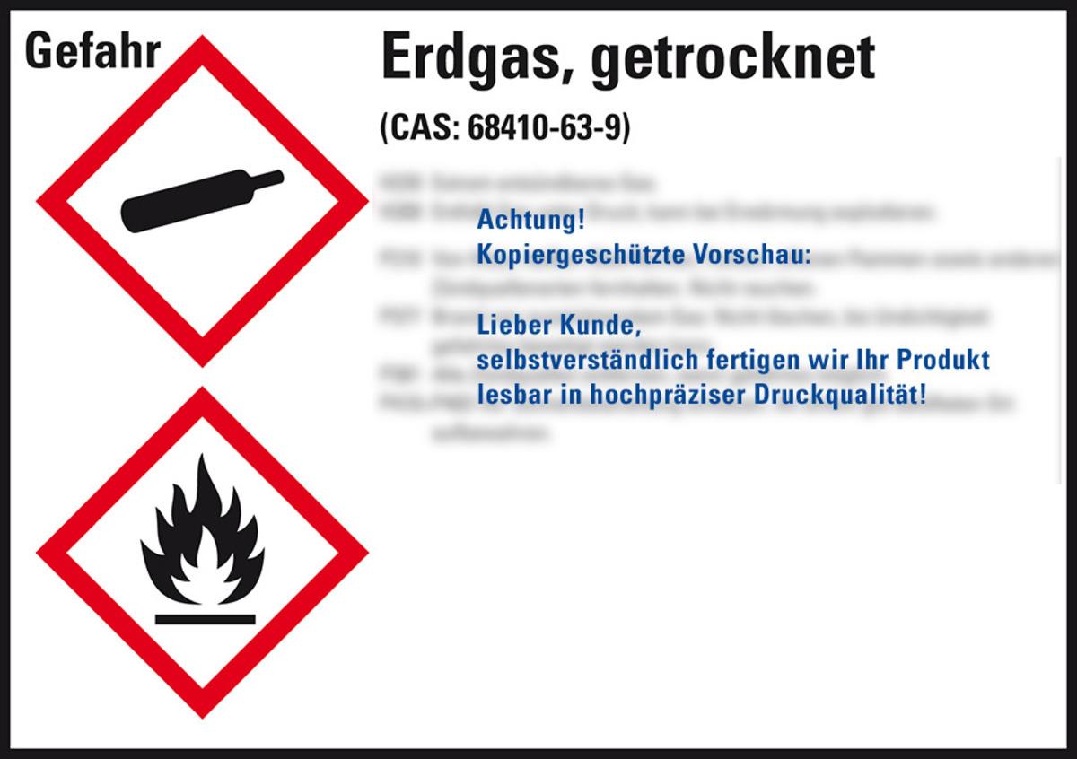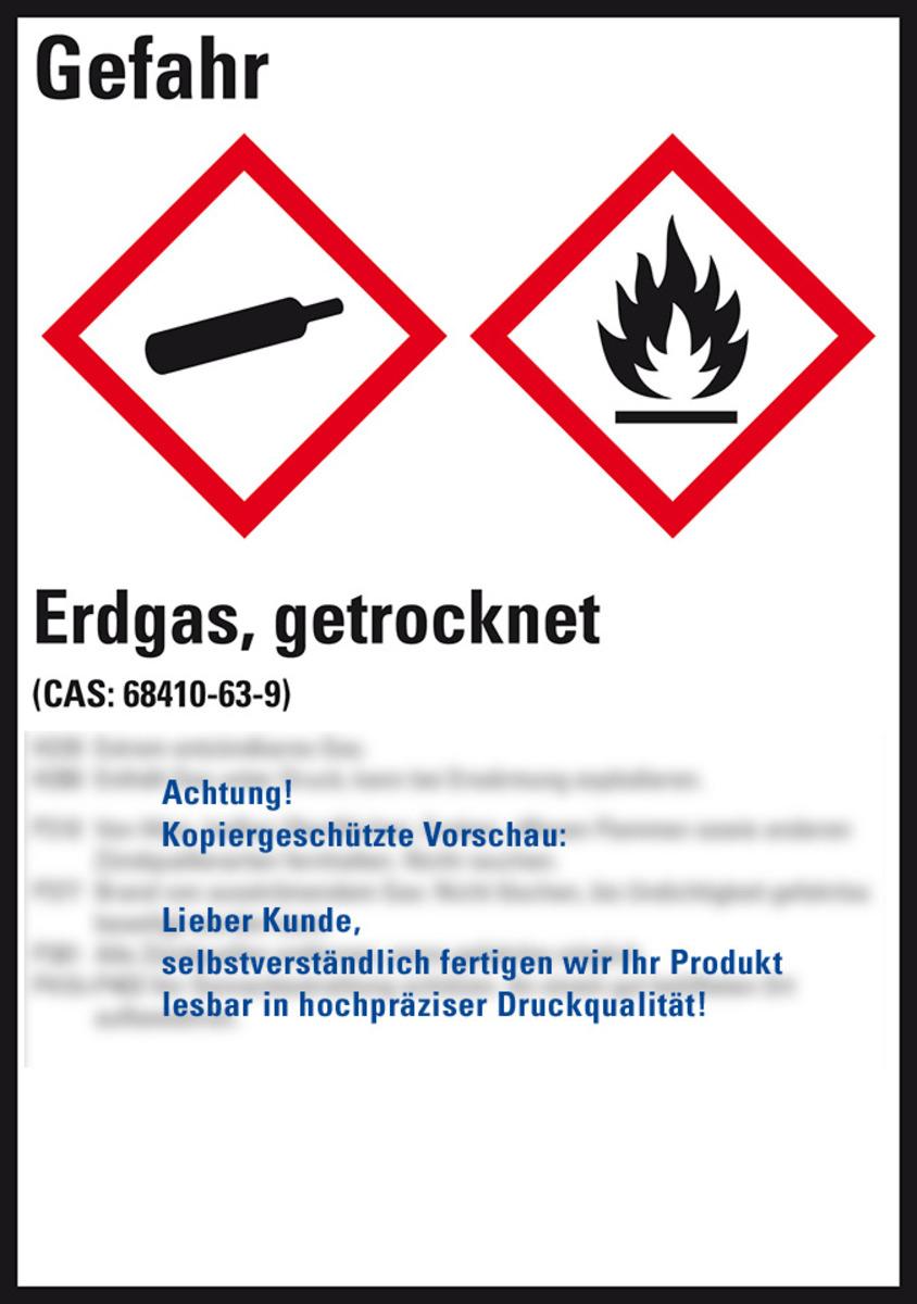 Auswahl: GHS-Etikett Erdgas getrocknet, gem.GefStoffV/GHS/CLP, Folie, 148x105mm, 4/Bogen