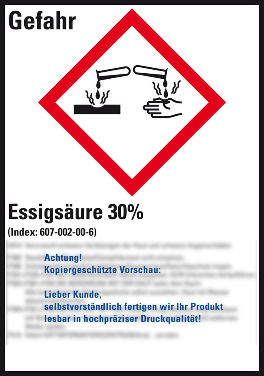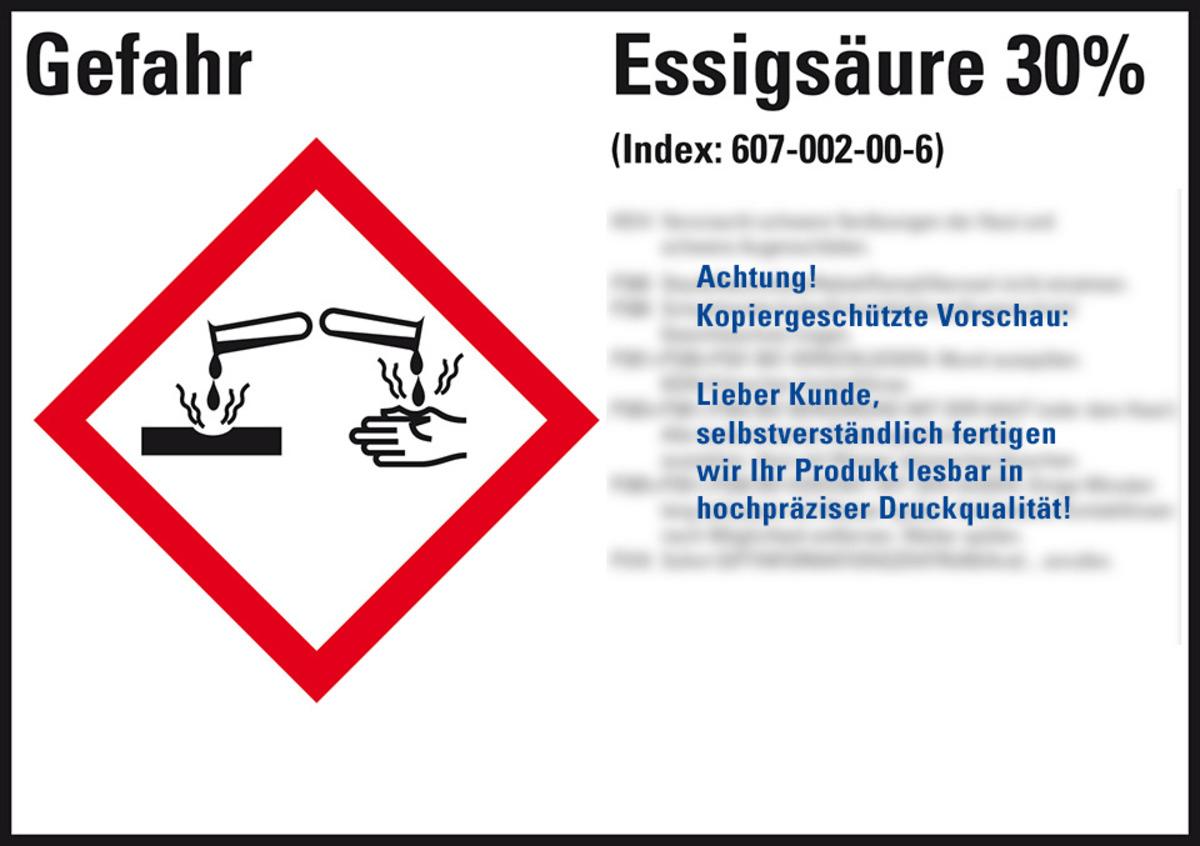 Auswahl: GHS-Etikett Essigsäure 30%, gem.GefStoffV/GHS/CLP, Folie, 52x74mm, 10/Bogen