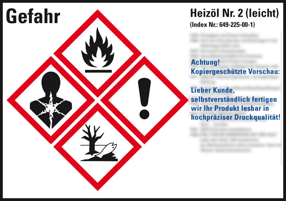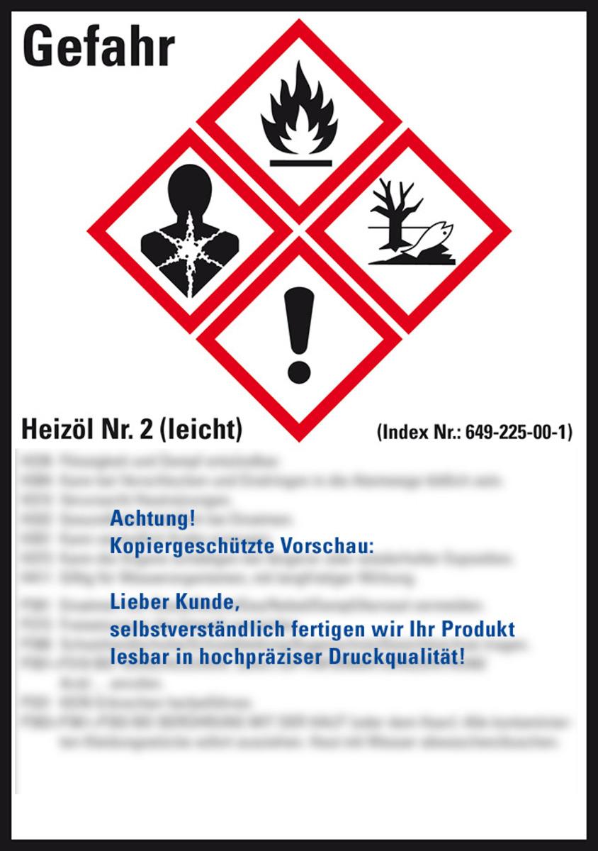 Auswahl: Gefahrstoffetikett Heizöl No.2, gem.GefStoffV/GHS/CLP, Folie, 148x105mm, 4/Bogen