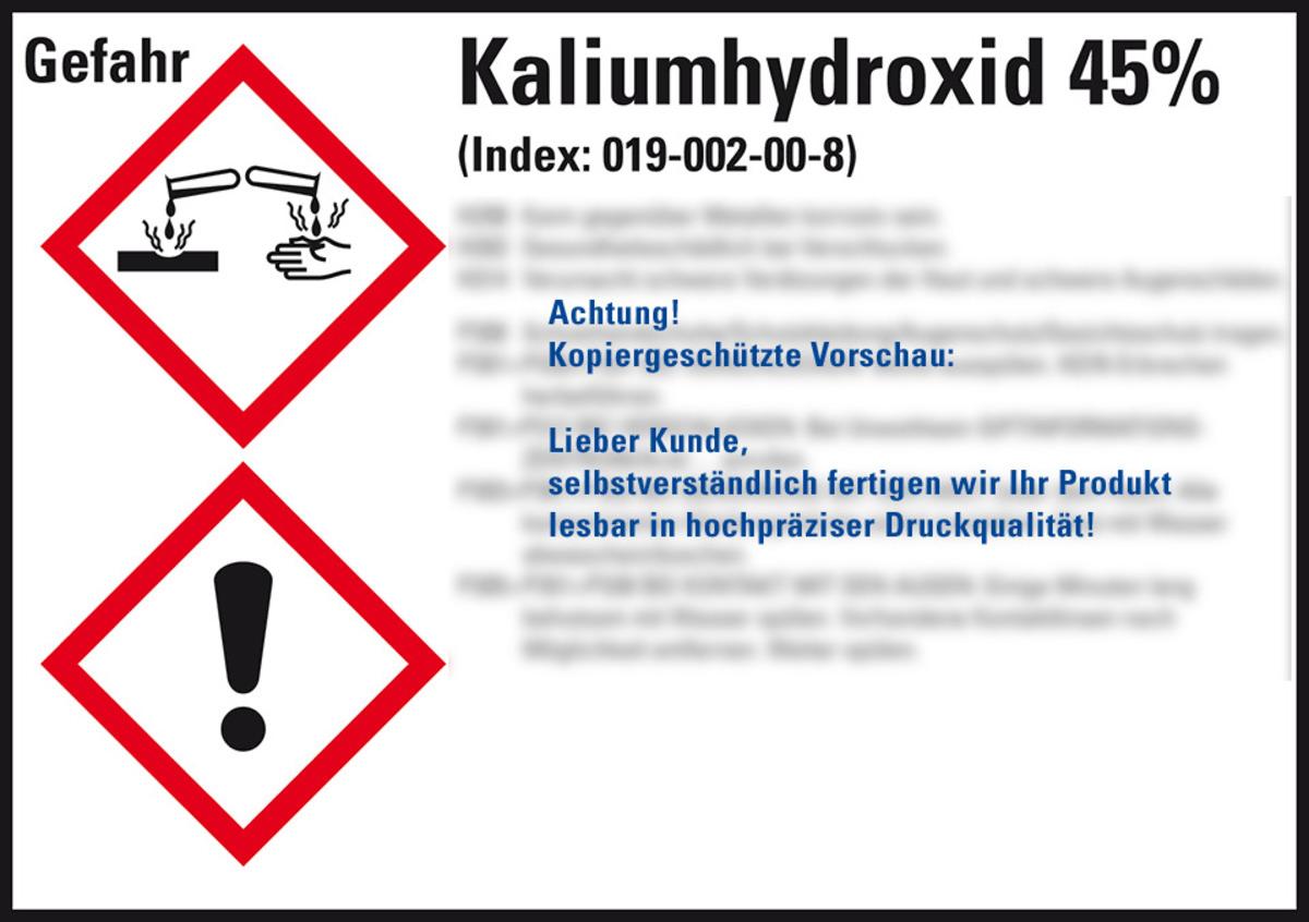 Auswahl: GHS-Etikett Kaliumhydroxid 45%, gem.GefStoffV/GHS/CLP, Folie, 105x74mm, 8/Bogen
