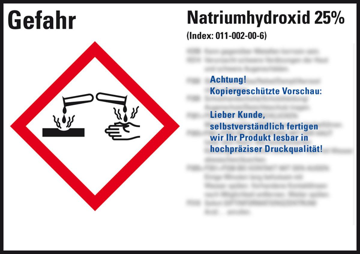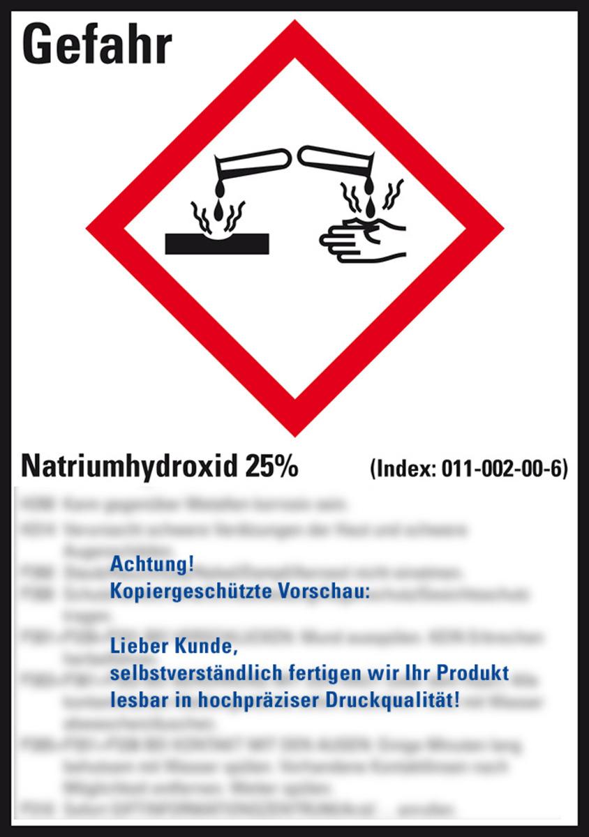 Auswahl: GHS-Etikett Natriumhydroxid 25%, gem.GefStoffV/GHS/CLP, Folie, 148x105mm, 4/Bogen