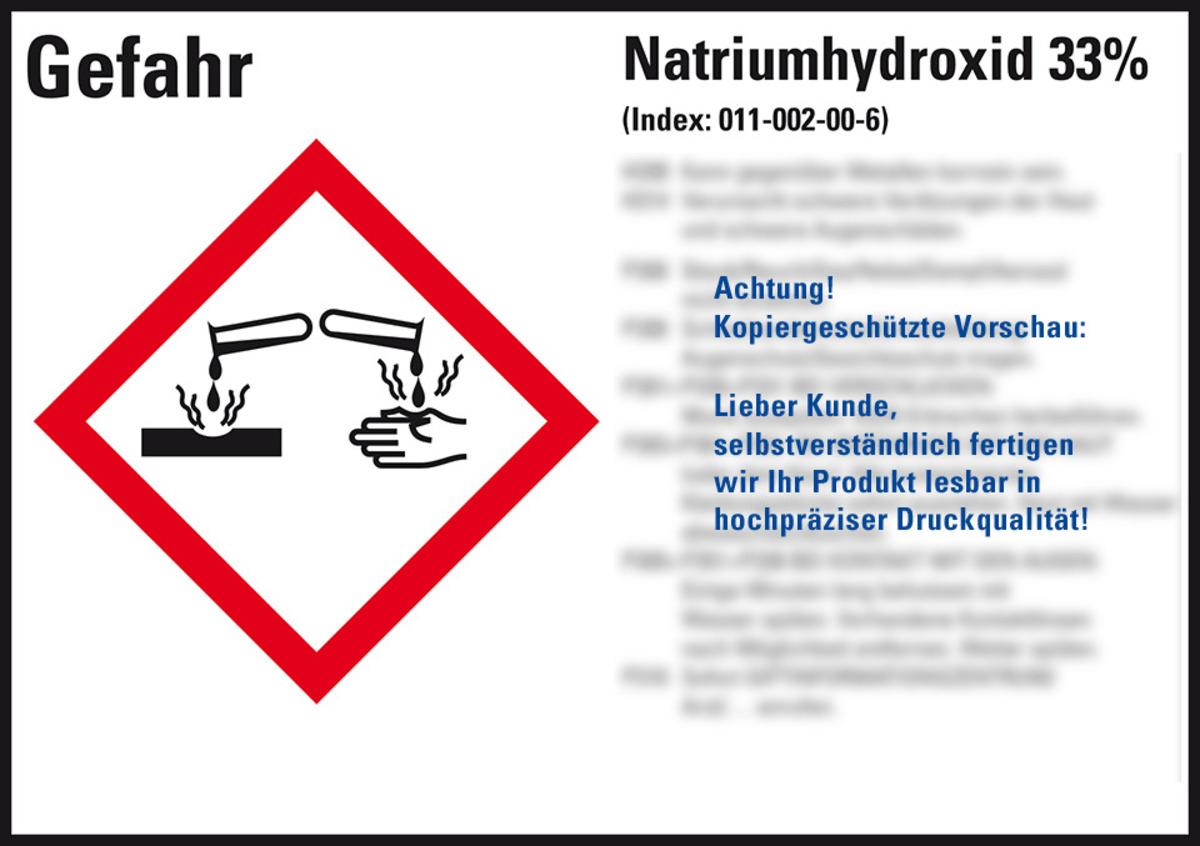 Auswahl: GHS-Etikett Natriumhydroxid 33%, gem.GefStoffV/GHS/CLP, Folie, 148x105mm, 4/Bogen