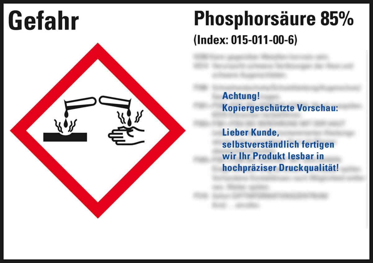 Auswahl: GHS-Etikett Phosphorsäure 85%, gem.GefStoffV/GHS/CLP, Folie, 52x74mm, 10/Bogen
