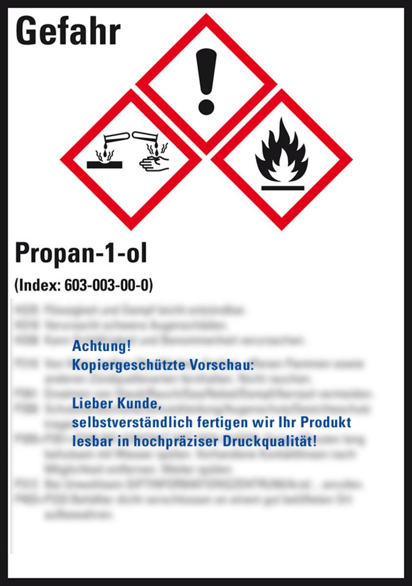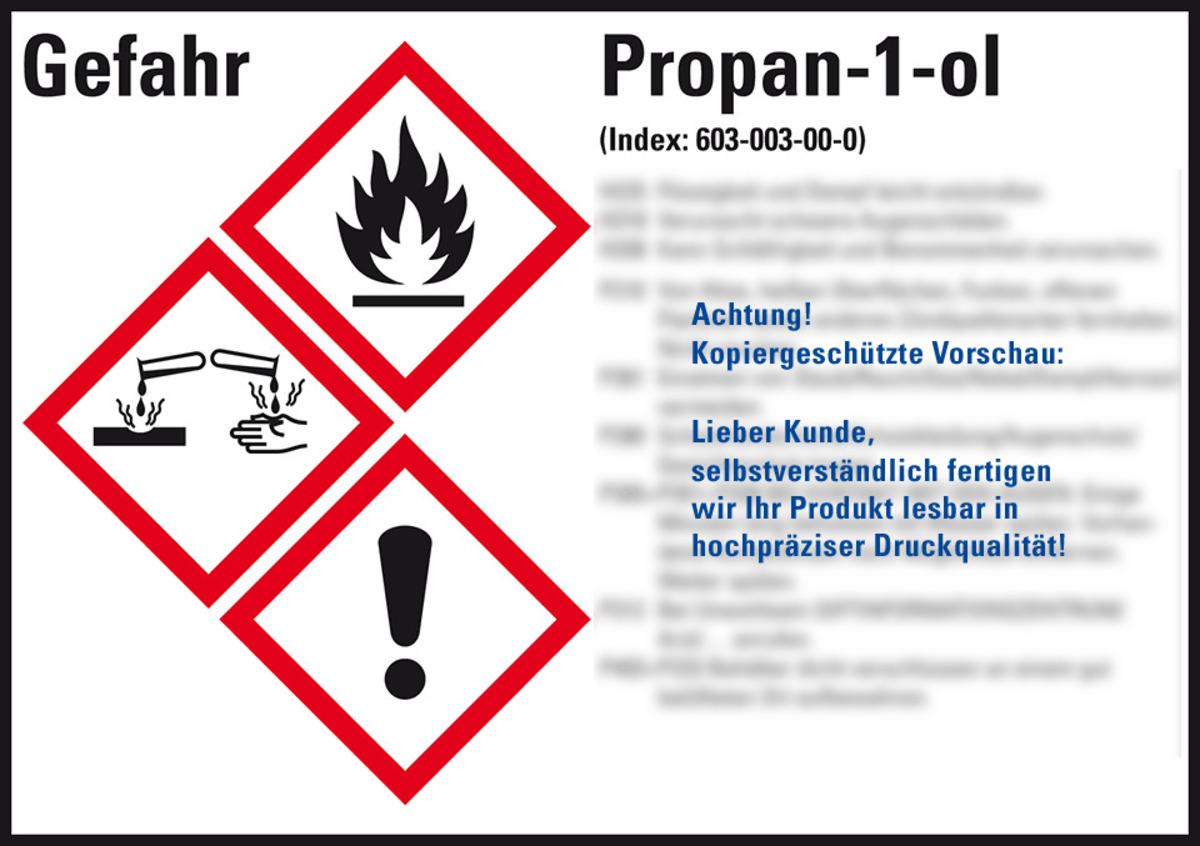 Auswahl: Gefahrstoffetikett Propan-1-ol, gem.GefStoffV/GHS/CLP, Folie, 105x74mm, 8/Bogen