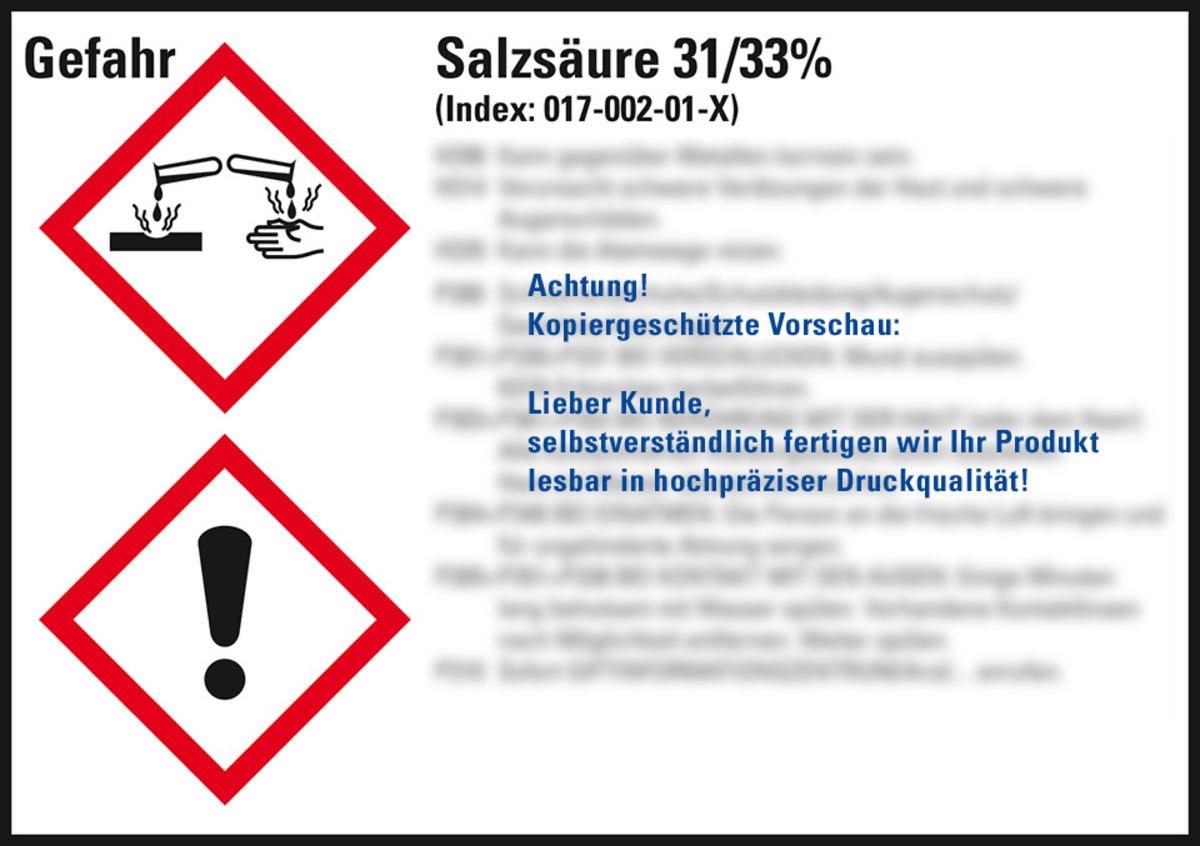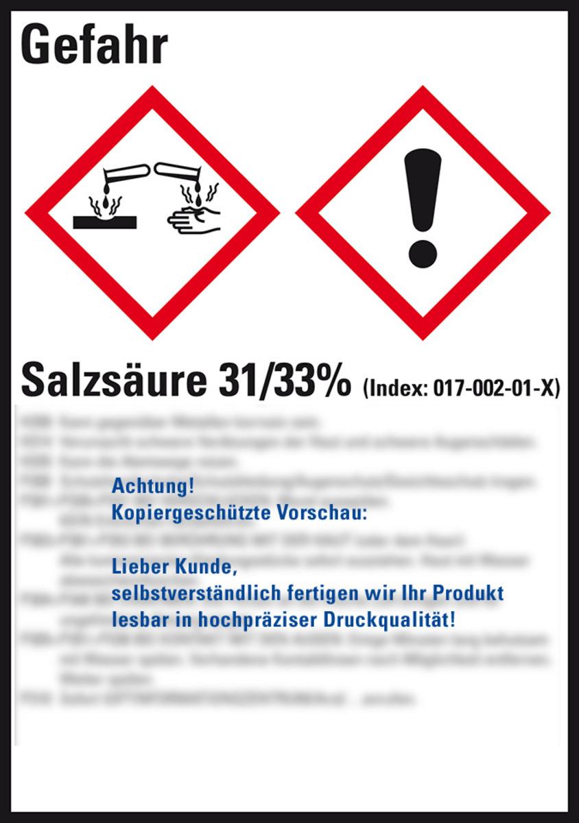Auswahl: GHS-Etikett Salzsäure 31/33%, gem.GefStoffV/GHS/CLP, Folie, 52x74mm, 10/Bogen