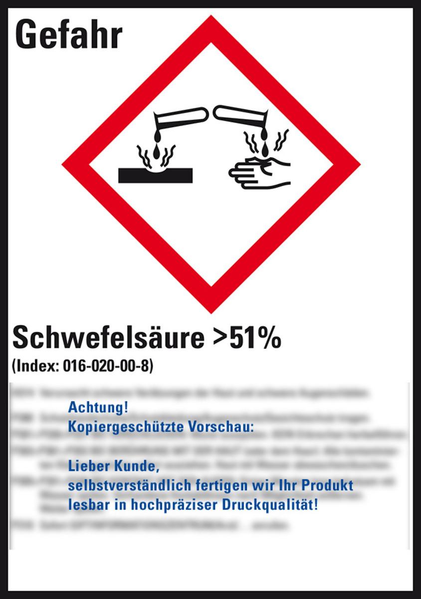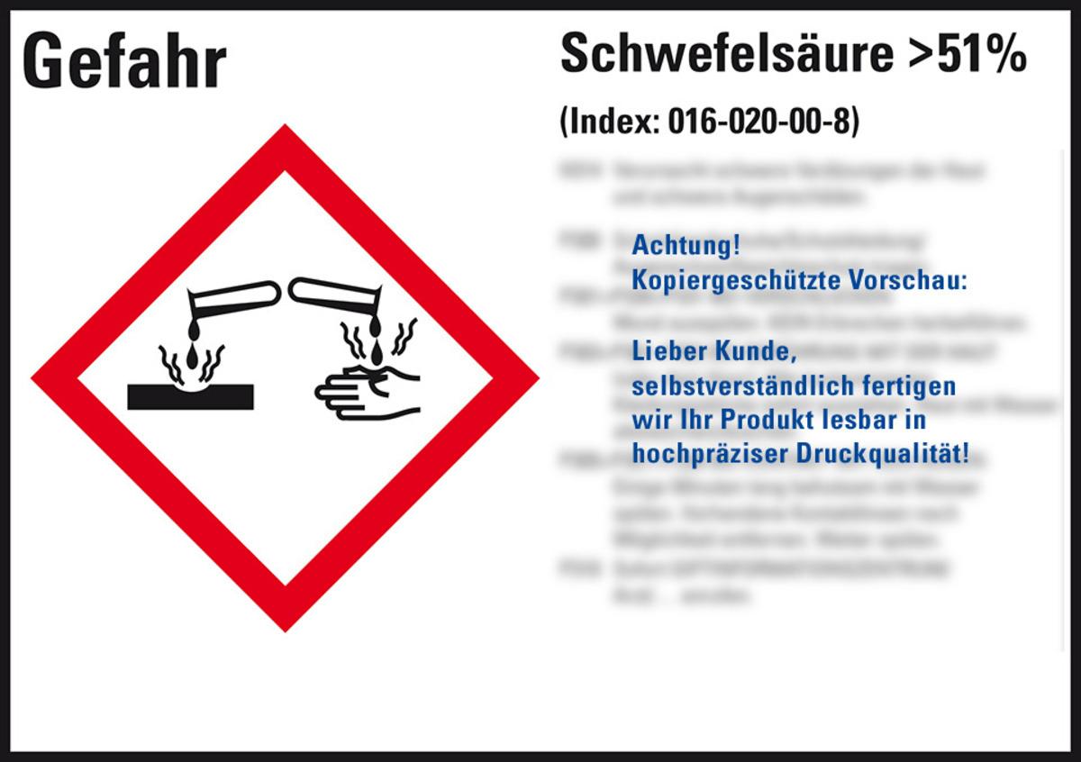 Auswahl: GHS-Etikett Schwefelsäure >51%, gem.GefStoffV/GHS/CLP, Folie, 105x74mm, 8/Bogen