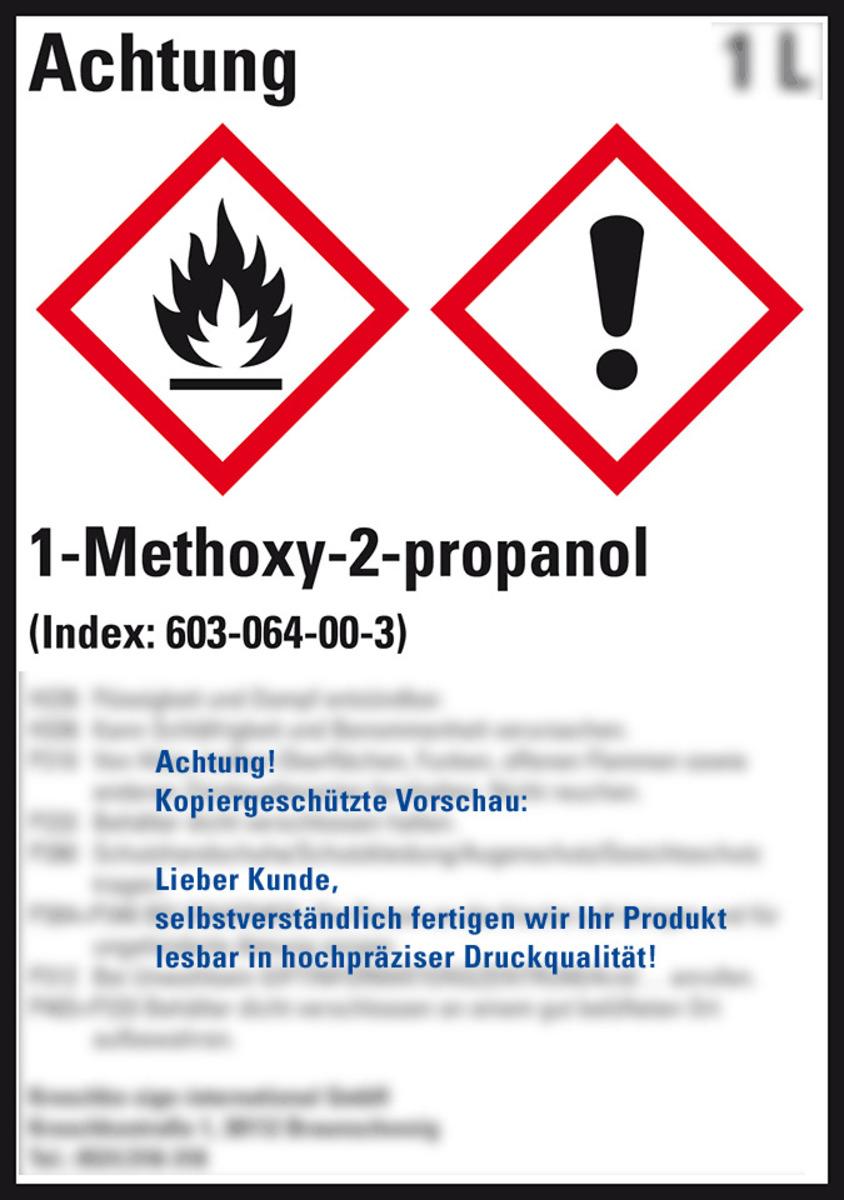 Auswahl: Gefahrstoffetikett 1-Methoxy-2-propanol, nach Wunsch, GefStoffV/GHS/CLP, 52x74mm, 10/Bogen
