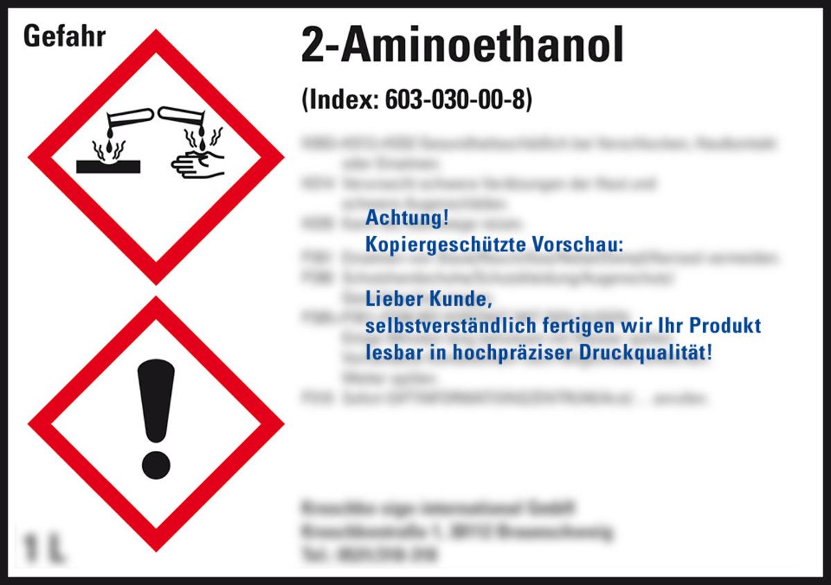 Auswahl: Gefahrstoffetikett 2-Aminoethanol, nach Wunsch, GefStoffV/GHS/CLP, Folie, 148x105mm, 4/Bogen