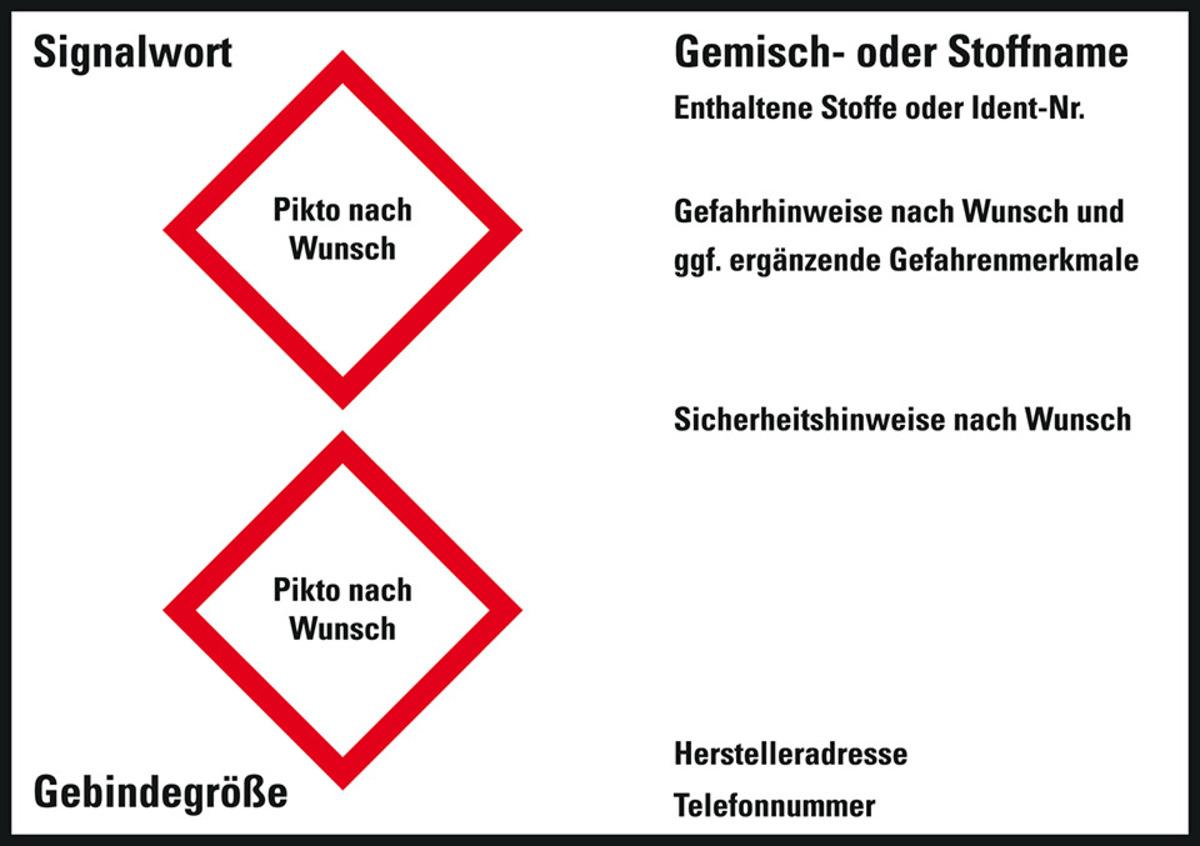 Gefahrstoffetikett nach Wunsch mit 2 Piktogrammen zur Identifizierung und innerbetrieblichen Kennzeichnung von Stoffen und Gemischen