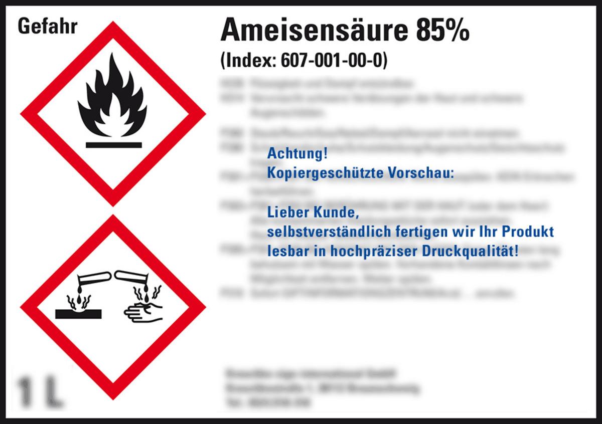 Auswahl: Gefahrstoffetikett Ameisensäure 85%, nach Wunsch, GefStoffV/GHS/CLP, Folie, 148x105mm, 4/Bogen