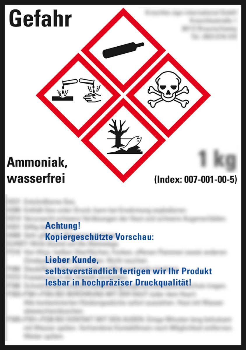 Auswahl: Gefahrstoffetikett Ammoniak, wasserfrei, nach Wunsch, GefStoffV/GHS/CLP, 52x74mm, 10/Bogen