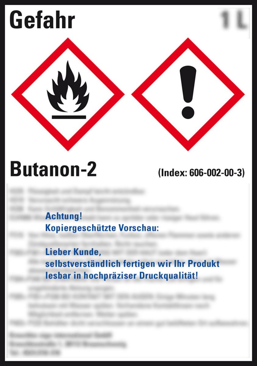 Auswahl: Gefahrstoffetikett Butanon-2, nach Wunsch, GefStoffV/GHS/CLP, Folie, 52x74mm, 10/Bogen