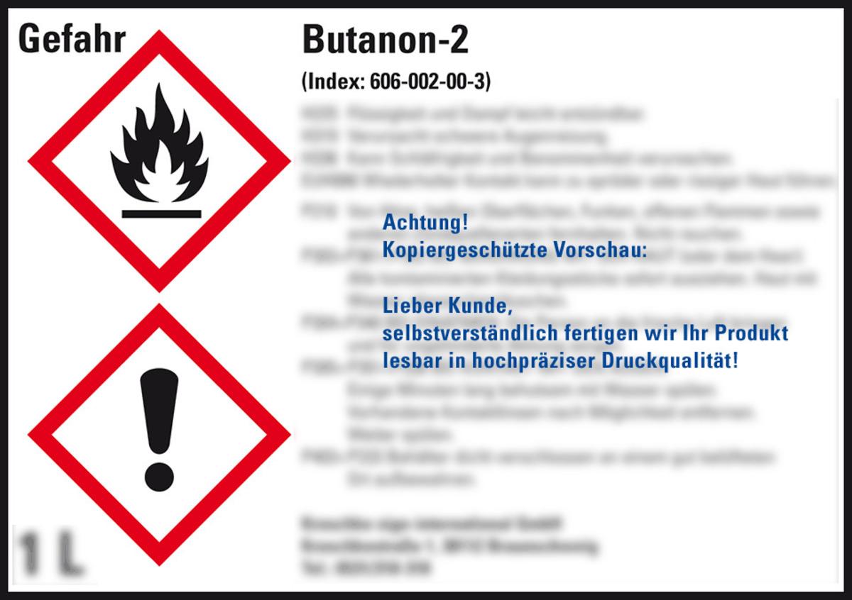 Auswahl: Gefahrstoffetikett Butanon-2, nach Wunsch, GefStoffV/GHS/CLP, Folie, 148x105mm, 4/Bogen