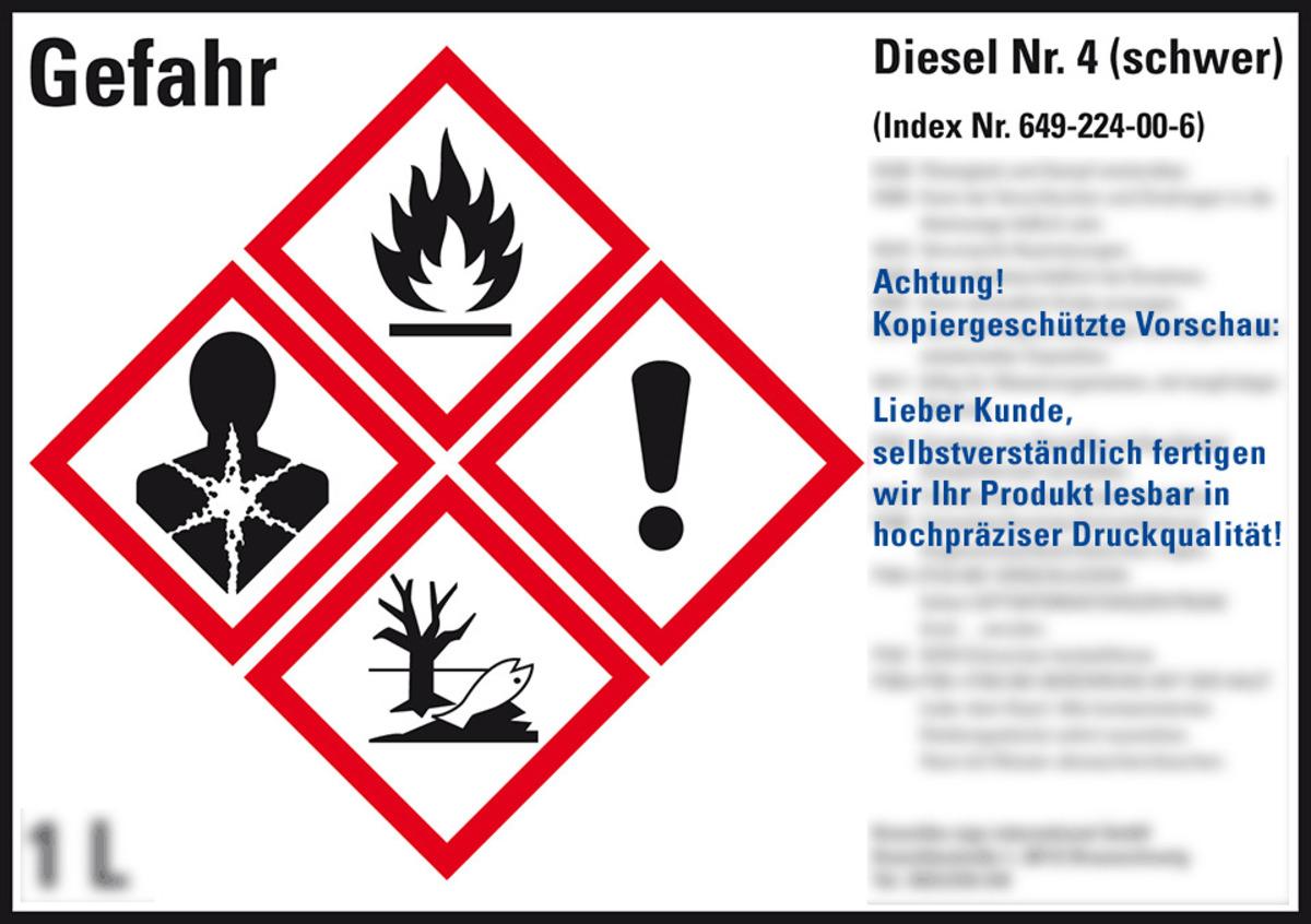 Auswahl: Gefahrstoffetikett Diesel schwer, nach Wunsch, GefStoffV/GHS/CLP, Folie, 105x74mm, 8/Bogen