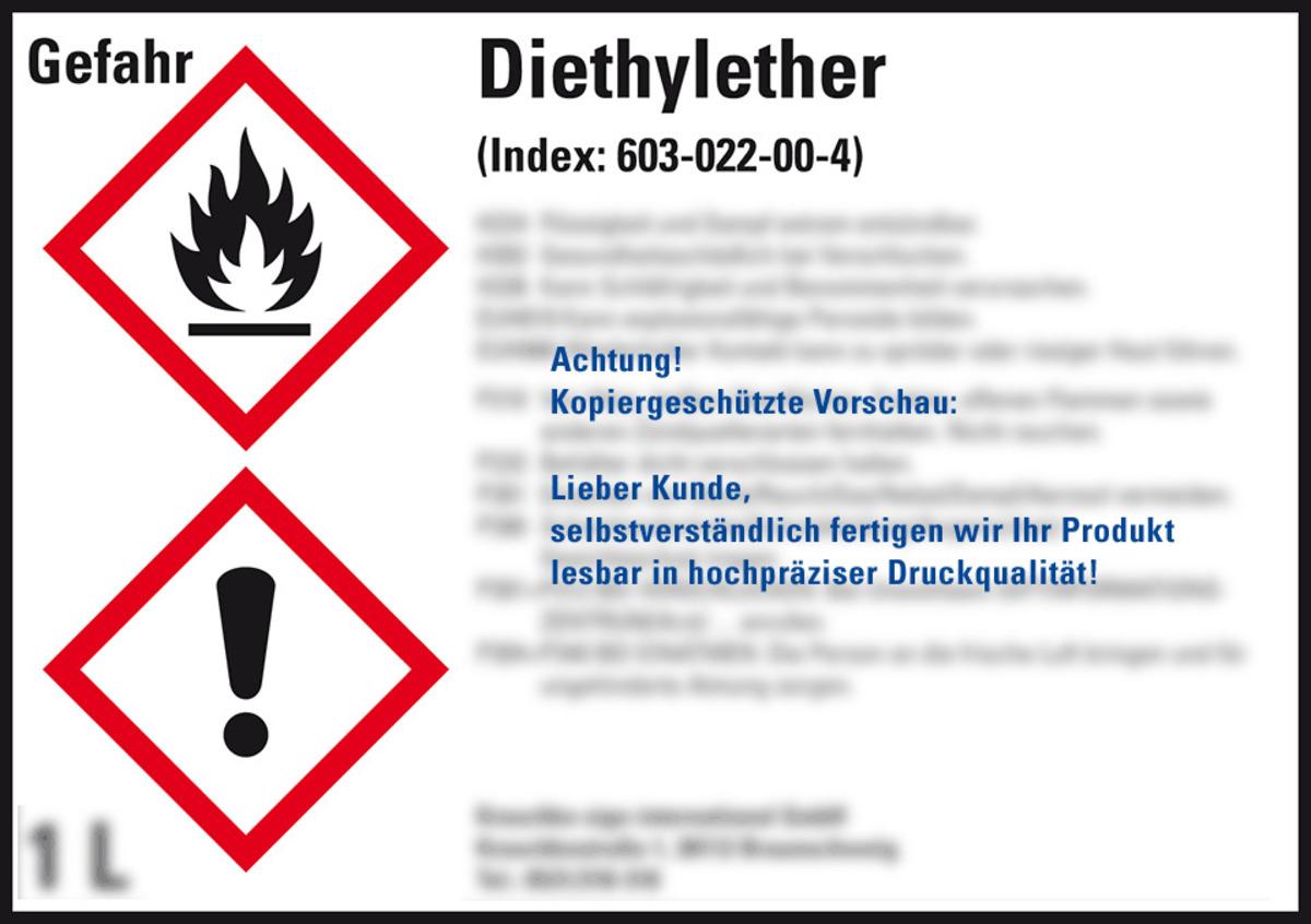 Auswahl: Gefahrstoffetikett Diethylether, nach Wunsch, GefStoffV/GHS/CLP, Folie, 105x74mm, 8/Bogen
