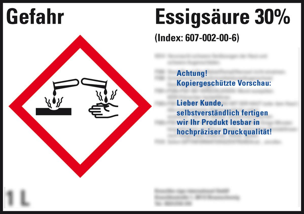 Auswahl: Gefahrstoffetikett Essigsäure 30%, nach Wunsch, GefStoffV/GHS/CLP, Folie, 148x105mm, 4/Bogen