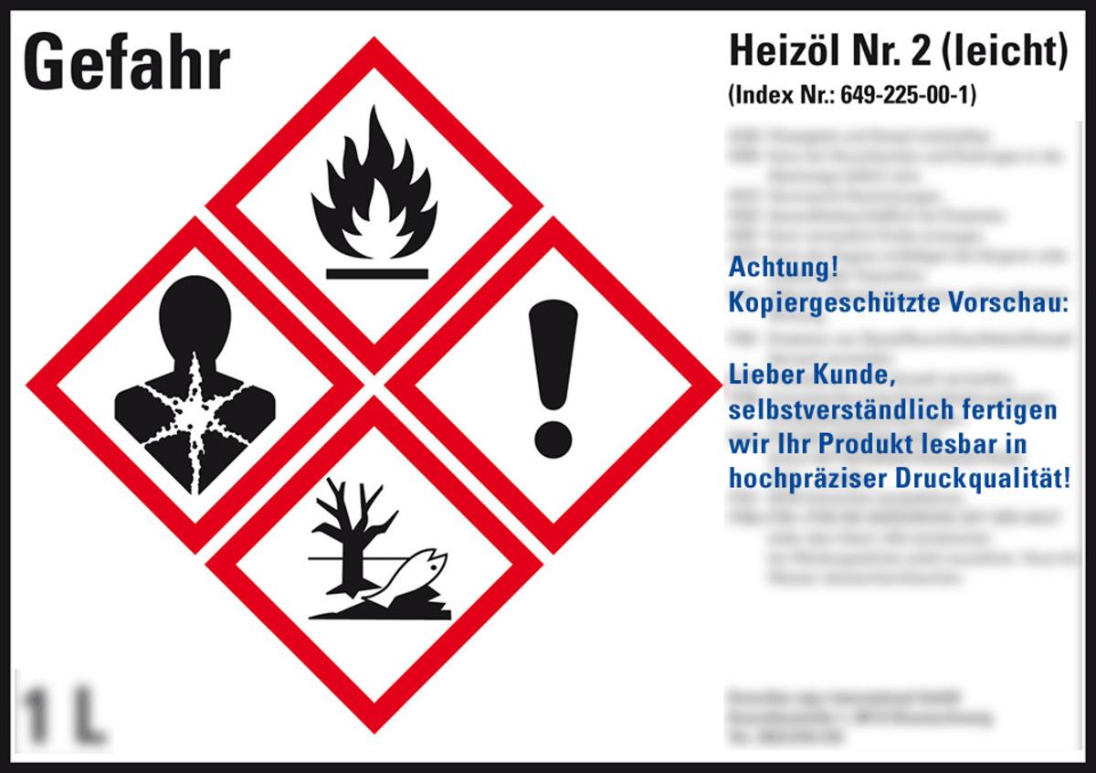 Auswahl: Gefahrstoffetikett Heizöl No.2, nach Wunsch, GefStoffV/GHS/CLP, Folie, 148x105mm, 4/Bogen