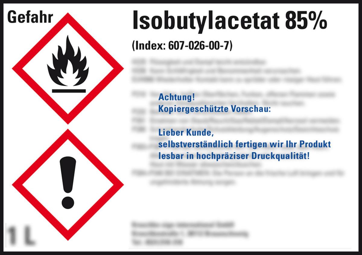 Auswahl: Gefahrstoffetikett Isobutylacetat 85%, nach Wunsch, GefStoffV/GHS/CLP, 105x74mm, 8/Bogen