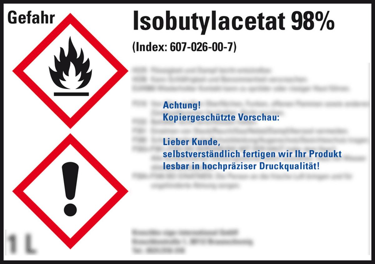 Auswahl: Gefahrstoffetikett Isobutylacetat 98%, nach Wunsch, GefStoffV/GHS/CLP, 105x74mm, 8/Bogen