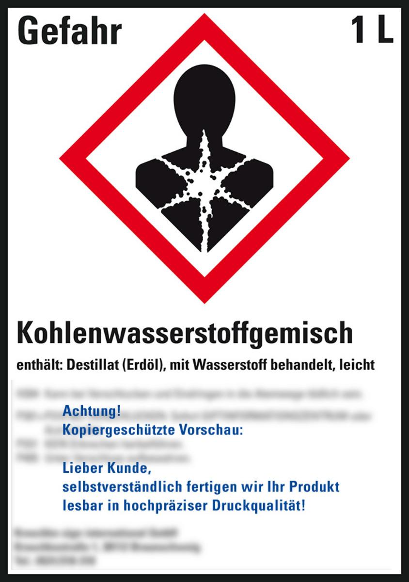 Auswahl: Gefahrstoffetikett Kohlenwasser.Gem., nach Wunsch, GefStoffV/GHS/CLP, Folie, 52x74mm, 10/Bogen