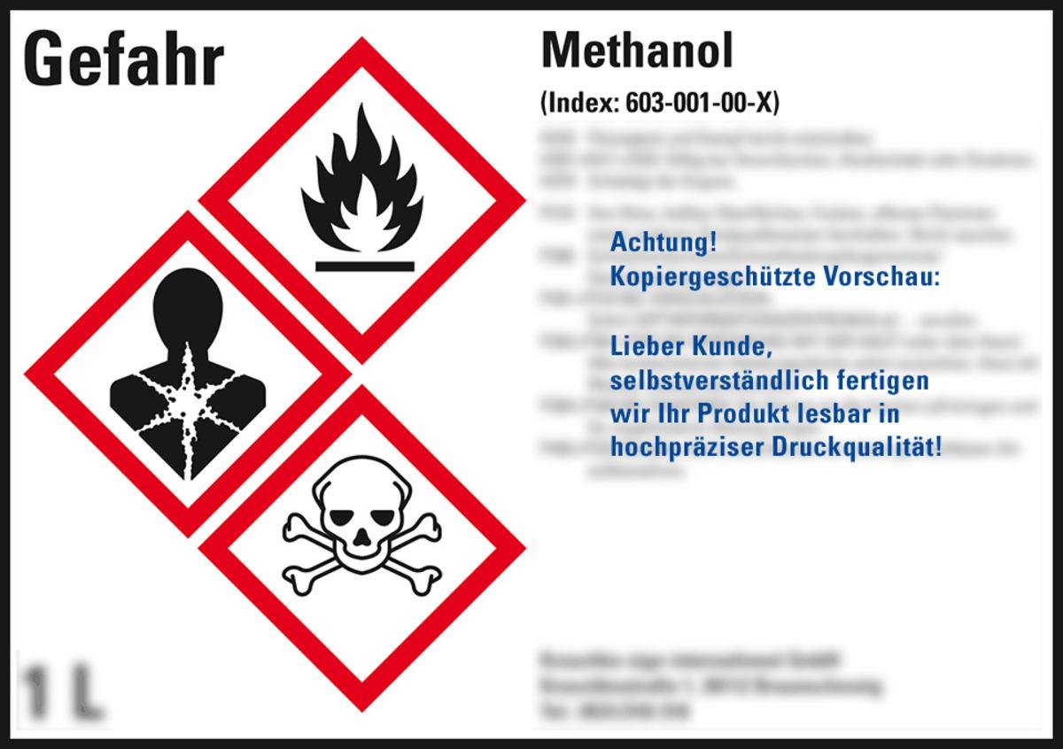 Auswahl: Gefahrstoffetikett Methanol, nach Wunsch, GefStoffV/GHS/CLP, Folie, 105x74mm, 8/Bogen