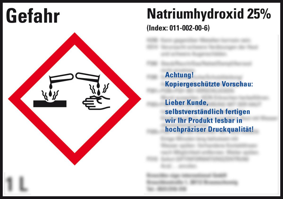 Auswahl: Gefahrstoffetikett Natriumhydroxid 25%, nach Wunsch, GefStoffV/GHS/CLP, 105x74mm, 8/Bogen