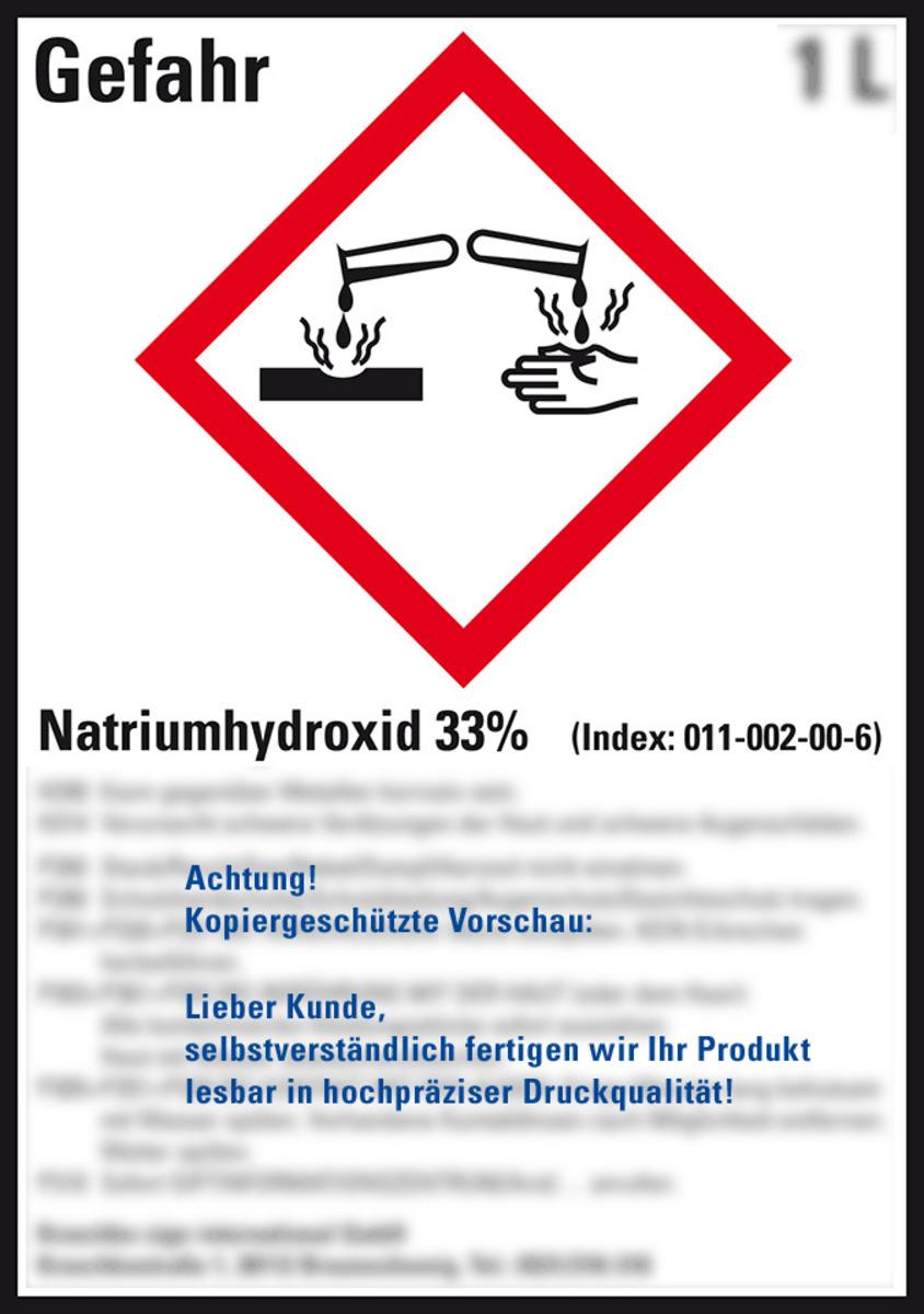 Auswahl: Gefahrstoffetikett Natriumhydroxid 33%, nach Wunsch, GefStoffV/GHS/CLP, 52x74mm, 10/Bogen