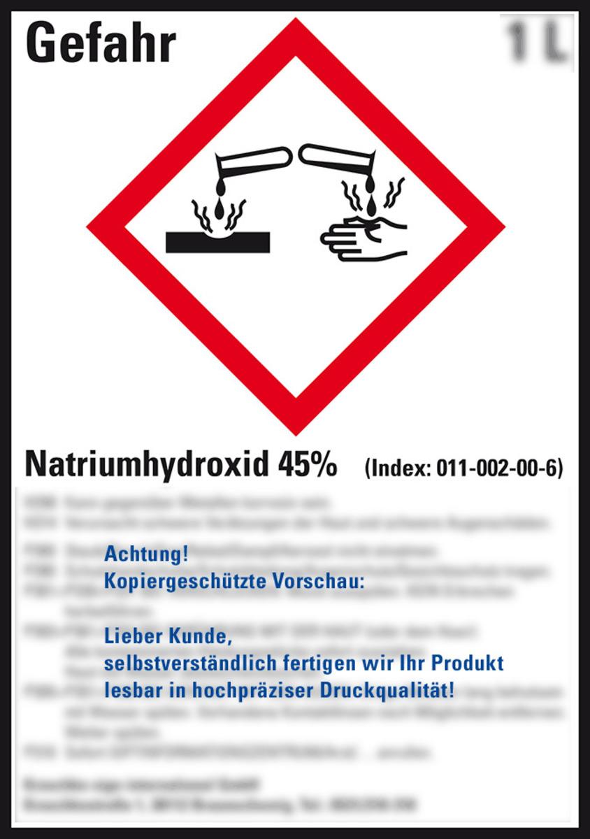Auswahl: Gefahrstoffetikett Natriumhydroxid 45%, nach Wunsch, GefStoffV/GHS/CLP, 52x74mm, 10/Bogen